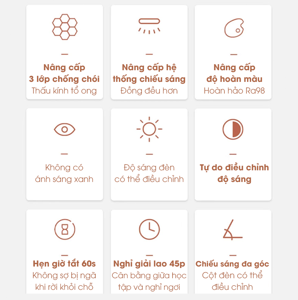TẠI SAO NÊN SỬ DỤNG ĐÈN BÀN : - Có thể lựa chọn ánh sáng Trắng hoặc Vàng THÔNG SỐ SẢN PHẨM - Nhiệt độ màu: Trắng 6500K - Vàng 3000K - Độ rọi trên