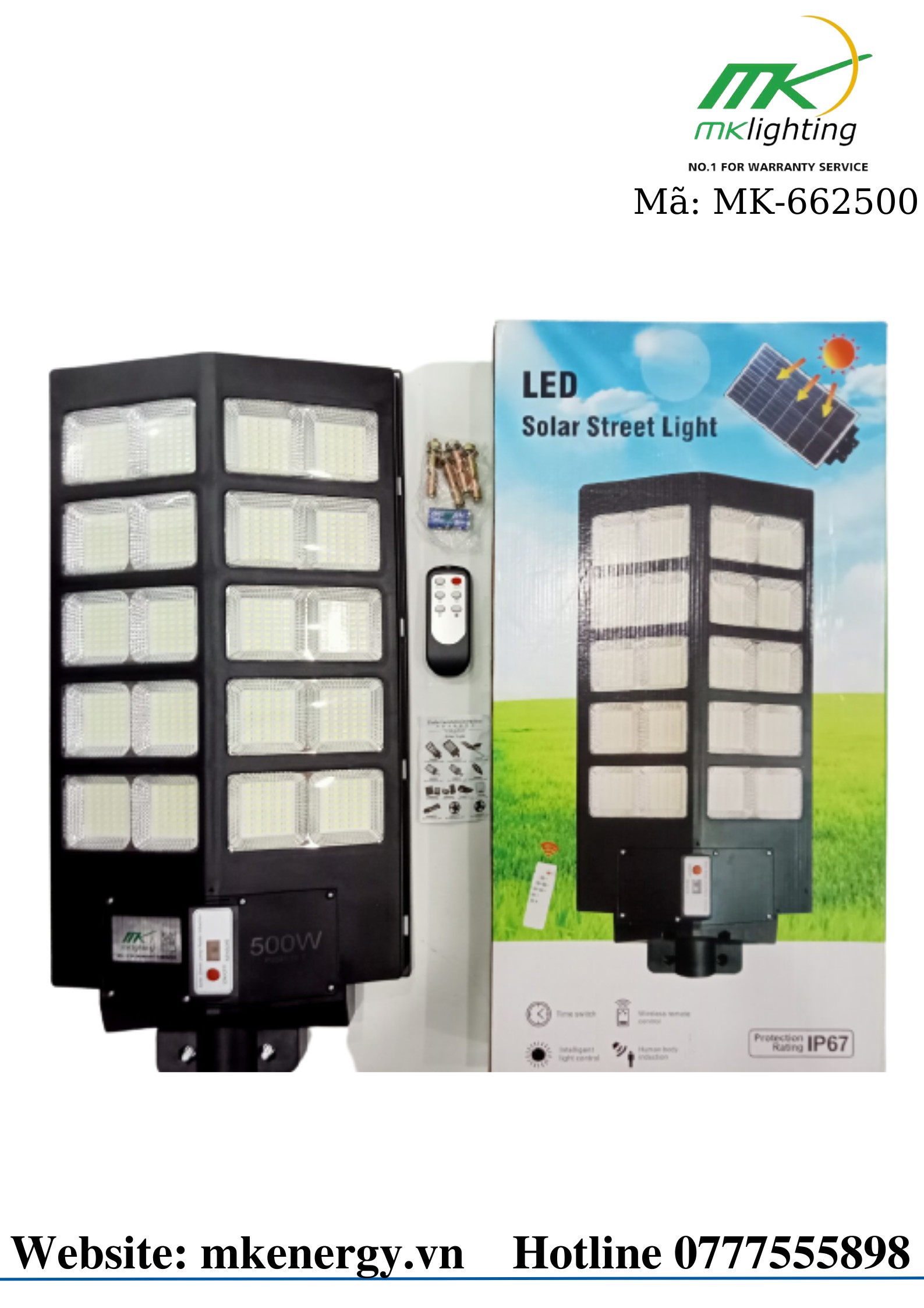 - Tích hợp điều khiển từ xa bằng tia hồng ngoại tiện lợi. Phạm vi chiếu sáng rộng, độ sáng cao Bền bỉ vượt thời gian Tiêu chuẩn bảo vệ IP65 Đèn năng lượng mặt trời MK được trang bị chuẩn IP65 có khả năng chống bụi và chống nước vượt trội, bạn có thể yên tâm sử dụng đèn ngoài trời trong mọi điều kiện thời tiết kể cả những ngày mưa bão mà không lo đèn sẽ bị hỏng hóc hay chập điện. Tấm pin năng lượng mặt trời Sử dụng chất liệu Solar PV Polycrystalline 7 lớp