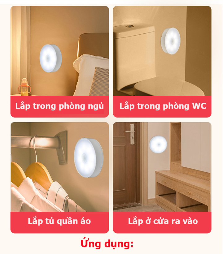 - Phù hợp gắn nhiều nơi như trong phòng ngủ, trong tủ quần áo, tủ chén bát, Toilet, hành lang, đầu giường, cửa ra vào, phòng có trẻ nhỏ,… Đèn cảm ứng với cảm biến chuyển động thông minh, tự động bật đèn khi có người chuyển động Khi đèn cảm ứng, cảm biến ở chỗ sáng sẽ tự động bật chế độ chờ (tắt). Khi ở chỗ tối, nếu người sử dụng di chuyển trong phạm vi đèn sẽ tự động bật sáng. Sau khi người sử dụng rời đi 20 - 30 giây, đèn ngủ sẽ tự động trở về chế độ chờ Đèn cảm ứng, cảm biến có độ sáng hài hòa bảo vệ mắt, ko ảnh hưởng đến giấc ngủ Đèn cảm ứng, cảm biến giúp bạn dễ dàng lắp đặt, sạc pin tiện lợi Đèn cảm ứng, cảm biến rất phù hợp gắn nhiều nơi như trong phòng ngủ, trong tủ quần áo, tủ chén bát, Toilet, hành lang, đầu giường, cửa ra vào, phòng có trẻ nhỏ,… Thông số kỹ thuật của Đèn cảm ứng, đèn cảm biến chuyển động