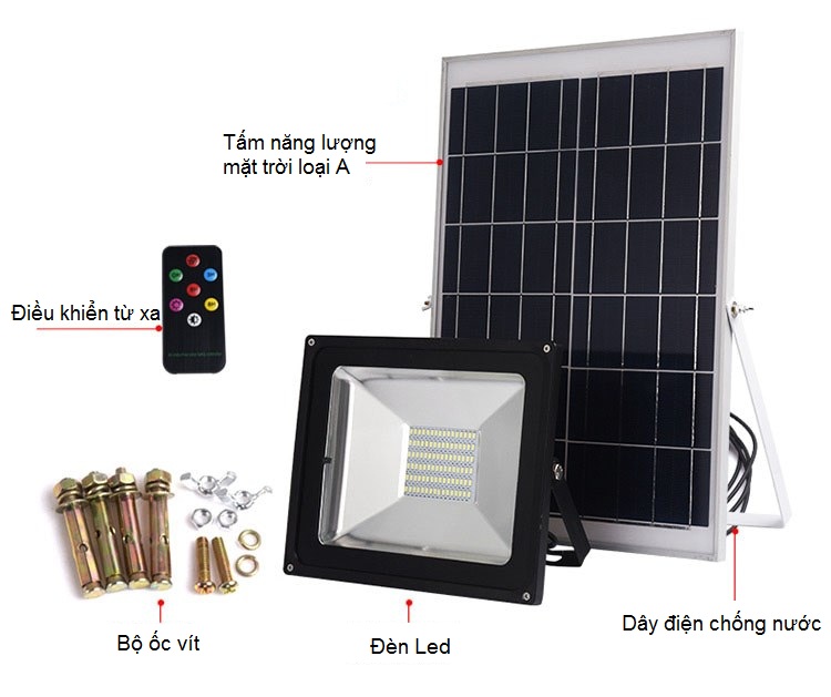 ĐÈN NĂNG LƯỢNG MẶT TRỜI 100w Giới thiệu sản phẩm Đèn LED năng lượng mặt trời 100w. Sử dụng chiếu sáng như đèn sân vườn cho biệt thự, đèn đường, đèn chiếu, đèn cho các khu đất rộng,