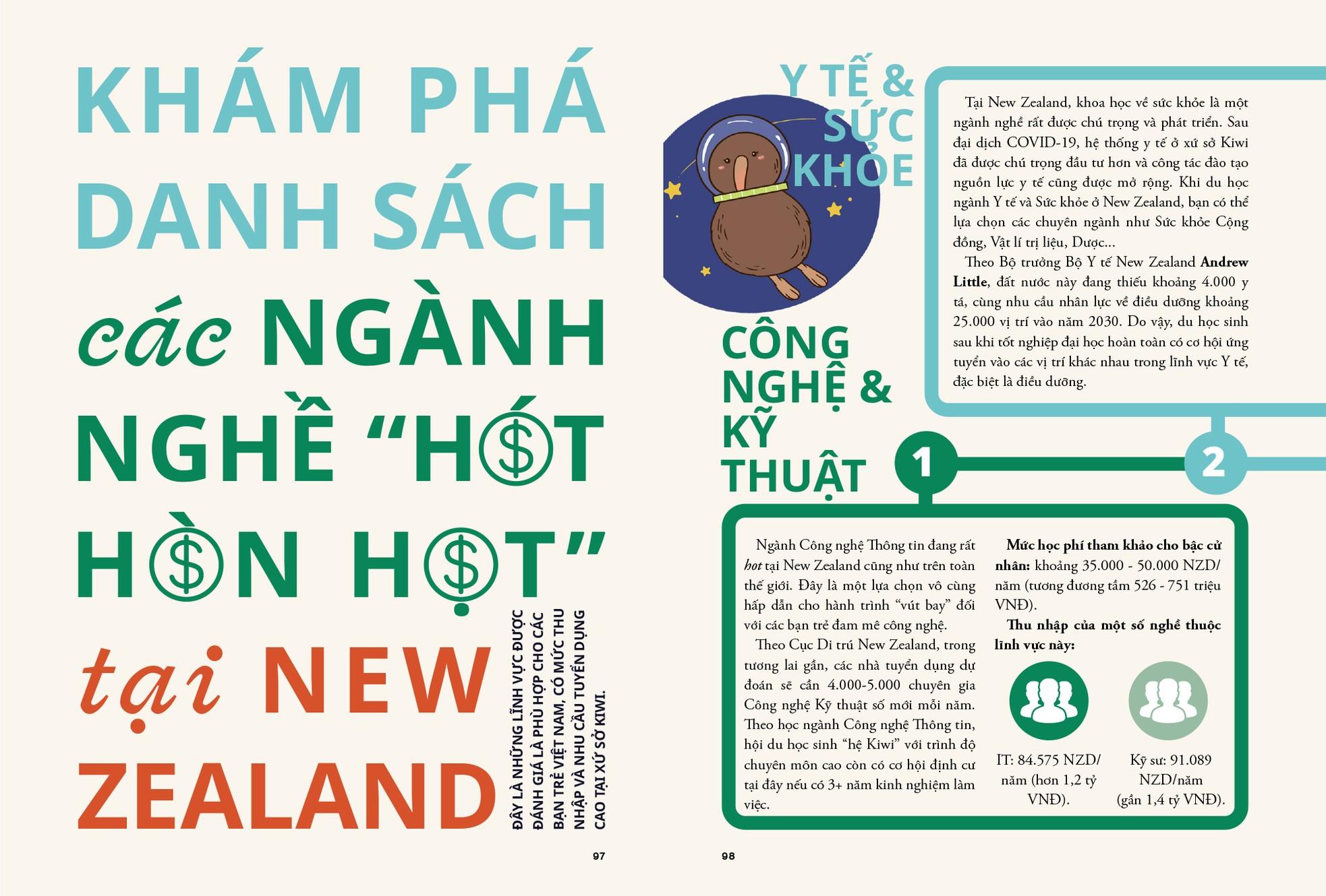 Cuốn sách Đến New Zealand đón bình minh mới được chia thành ba chương, theo lộ trình Học, Làm và Sống.