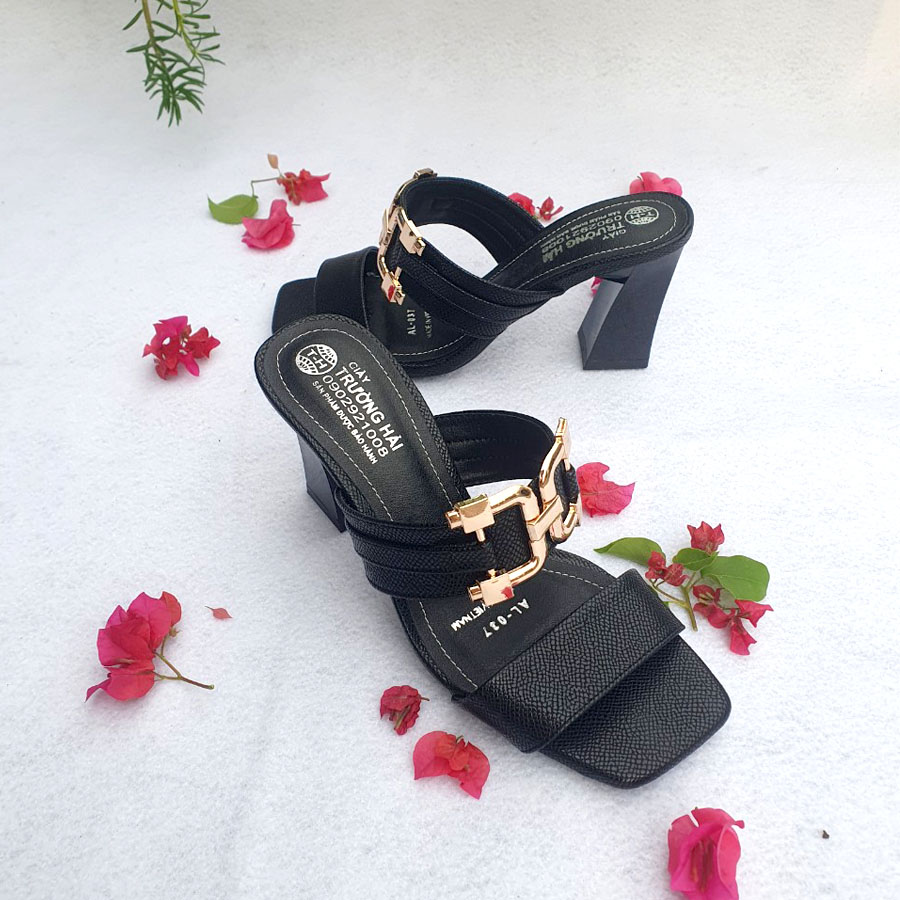 - Dép cao gót TRường Hải màu đen gót vuông 8cm da mềm DN138 thiết kế với kiểu dáng ôm chân, thon gọn, thoải mái di chuyển mà không lo đau chân, đi lên chân nhìn vô cùng sang chảnh và rất dễ phối đồ như quần vải, jeans, kaki, hay những bộ váy điệu đà nữ tính.