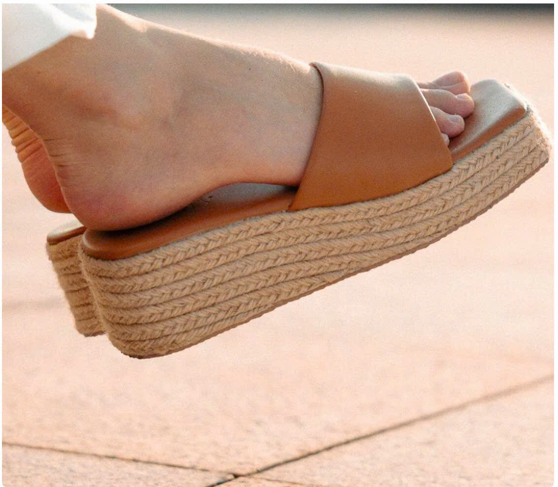 - Phần đế xuồng được viền cói (espadrille) tỉ mỉ, không chỉ tạo điểm nhấn tự nhiên, mộc mạc mà còn giúp "ăn gian" chiều cao một cách khéo léo, mang lại vóc dáng thanh thoát và uyển chuyển.