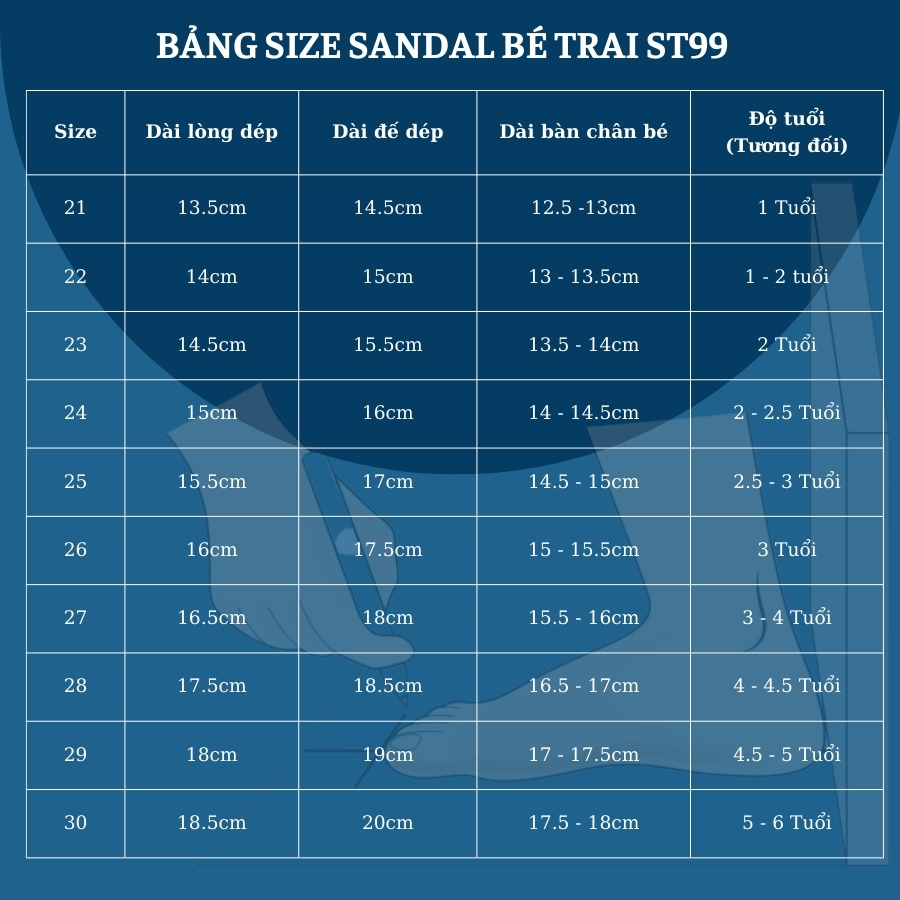 BẢNG SIZE SANDAL BÉ TRAI ST99