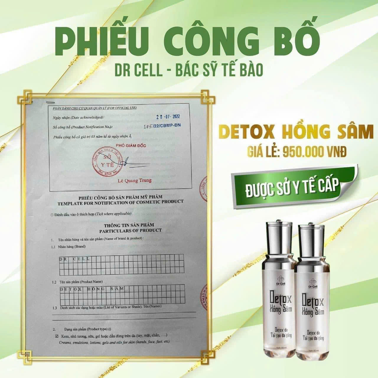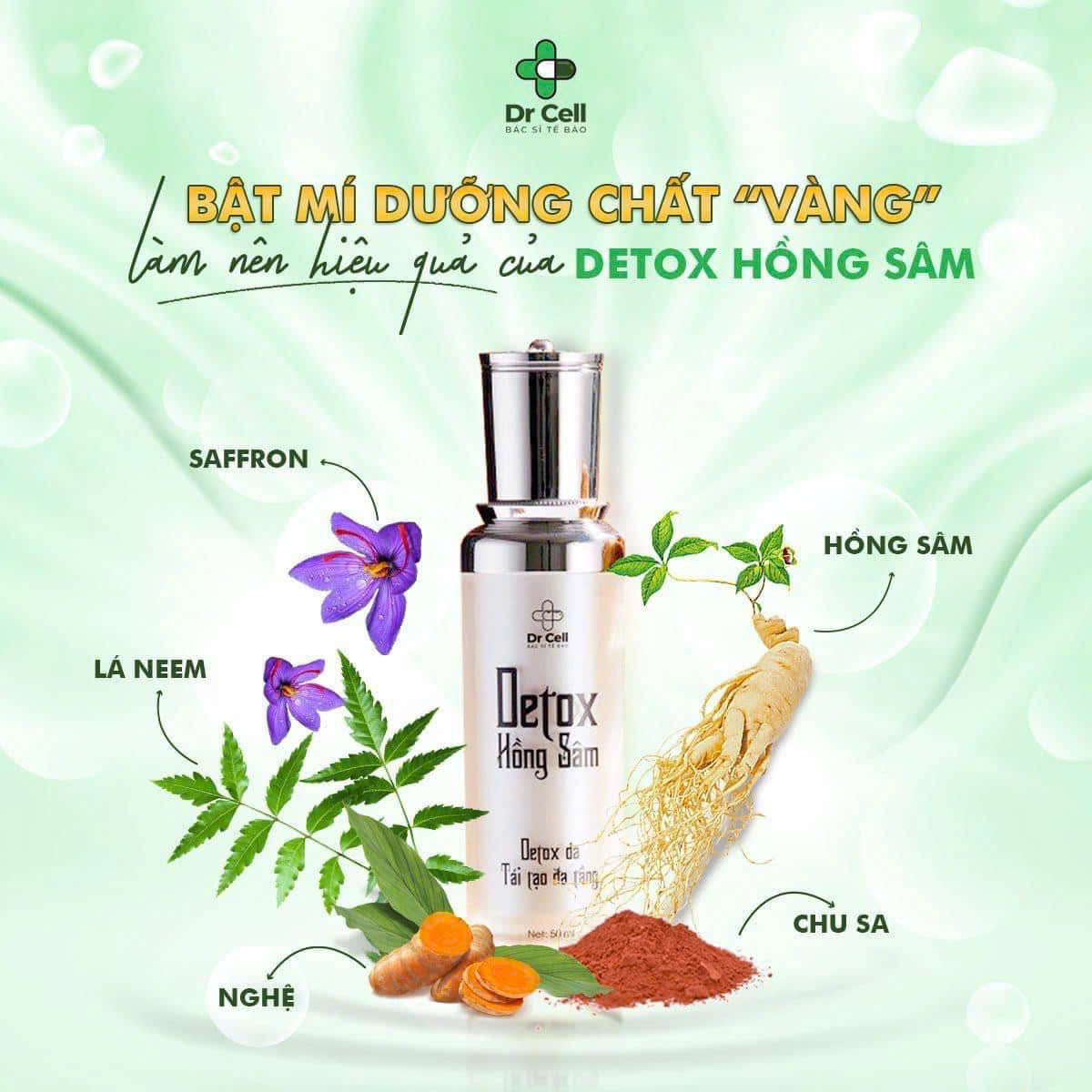 Detox Hồng Sâm Dr Cell 50ml THÀNH PHẦN: Aqua, Huyết sâm, chu sa, bạch phụ tử, bạch chỉ , oải hương, nhuỵ hoa, nghệ tây , lá nêm, nấm linh chi, dầu tràm , nghệ, mật ong, dấm táo. CÔNG DỤNG: - Detox thải độc da. - Đào thải cặn bã và độc tố dưới tầng da. - Tái tạo đa tầng. - Hỗ trợ se chân lông. - Hỗ trợ tăng sinh tế bào da mới sáng hồng. - Giảm mụn. - Giúp tăng tế bào hỗ trợ cải thiện sẹo rỗ CÁCH DÙNG: Lắc đều sản phẩm sau đó thoa trực tiếp lên vùng da cần tái tạo. 3 ngày đầu thoa 1 lần/ngày, sau đó tăng dần lên 2-3 lần/ngày. Sau 2-3 tuần sử dụng, kết hợp lấy nhân mụn đối với các trường hợp mụn nặng để rút ngắn thời gian đtri. Khi da bắt đầu bong vẫn tiếp tục sử dụng liều dưỡng cho đến khi hết mụn, thâm hoặc nám. Khi cảm thấy da đã đẹp, đợi bong lớp da cuối cùng để kết thúc liệu trình và chuyến qua dưỡng da.