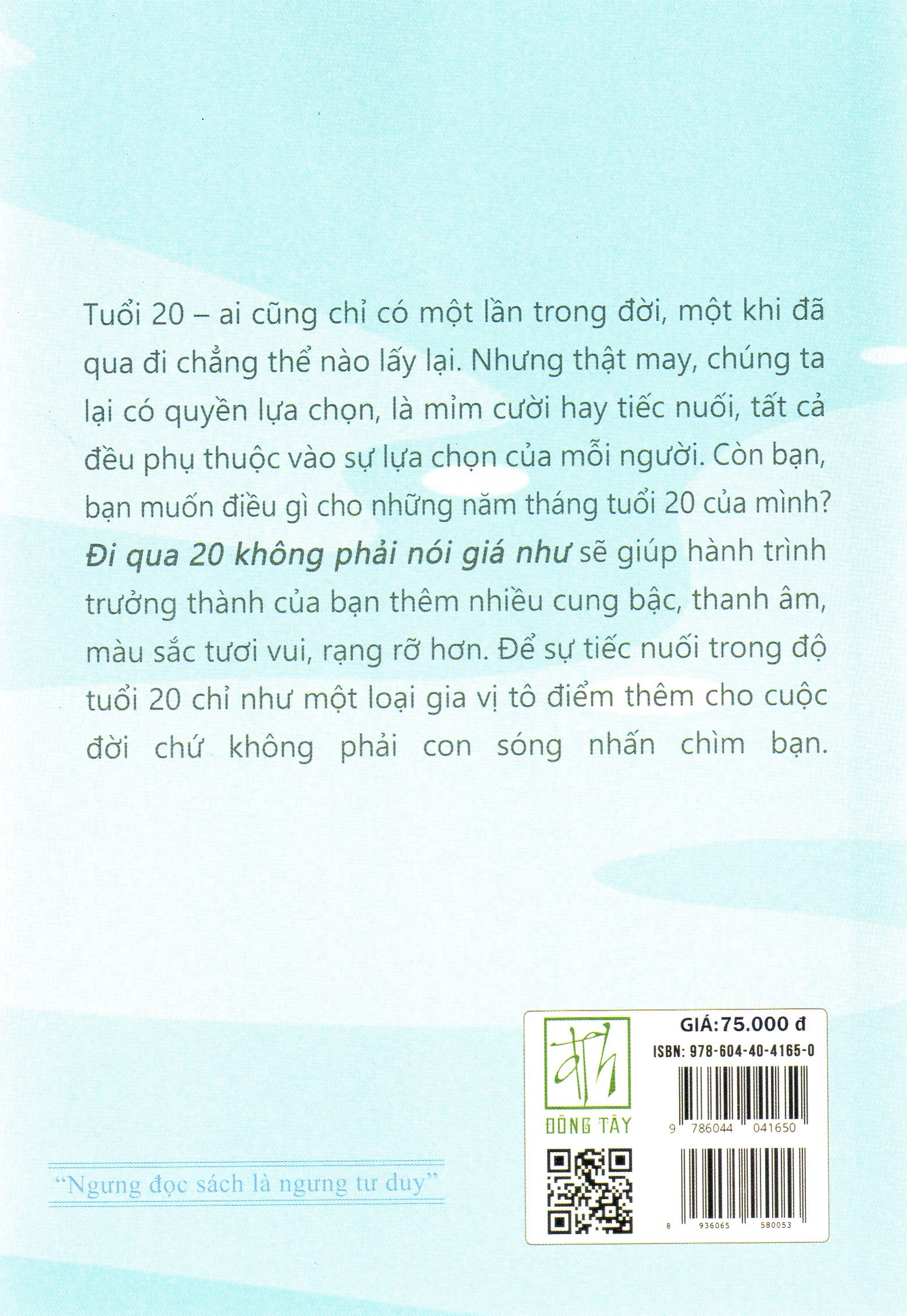"Đi qua 20 không phải nói giá như" là những câu chuyện thực tế và sâu sắc, được đúc kết từ kinh nghiệm cá nhân của tác giả - một người đã từng trải qua tuổi 20 với nhiều cung bậc cảm xúc và bài học quý giá. Cuốn sách sẽ giúp bạn trẻ tuổi nhận ra rằng, những quyết định và hành động trong tuổi 20 sẽ góp phần rất lớn trong việc định hình cuộc đời sau này.