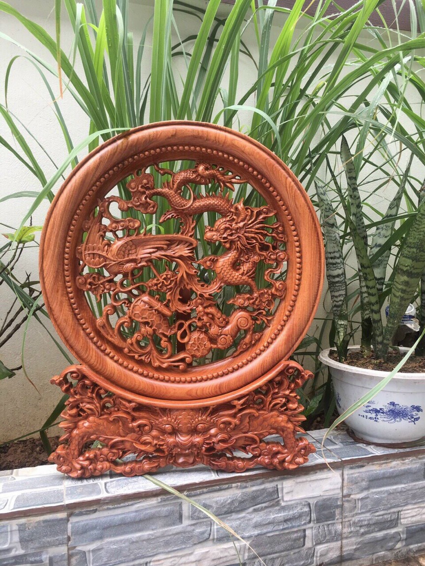 ✨Đĩa trang trí phong thủy trạm khắc tứ linh bằng gỗ hương đá kt mặt rộng 50×4,5cm