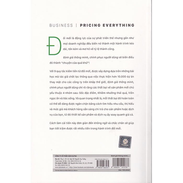 Định giá thông minh, chinh phục người dùng trình bày một cách tiếp cận thực tế có thể được áp dụng bởi bất kỳ tổ chức nào, trong bất kỳ ngành nào. Các công ty phải suy nghĩ lại về các hoạt động đổi mới có chi phí hàng tỷ đô-la. Cuốn sách sẽ chỉ cho bạn cách tìm kiếm những gì khách hàng đánh giá cao và mức giá mà họ sẵn sàng chi trả cho sản phẩm hoặc dịch vụ của bạn, sau đó thiết kế sản phẩm và dịch vụ ấy xoay quanh giá cả.