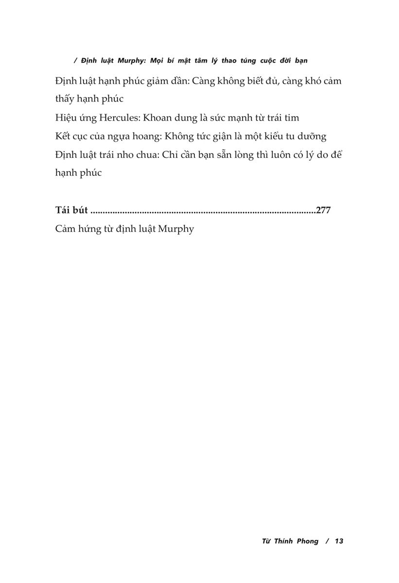 Tuy nhiên, định luật Murphy mang tính cảnh tỉnh và dẫn dắt rất lớn trong cuộc sống hằng ngày. Cuốn sách này giới thiệu đến với bạn đọc về kiến thức cơ bản, hiện tượng thường gặp cùng với các hiệu ứng tâm lý học biểu hiện trong ý thức cá nhân, tính cạnh tranh, quan hệ xã hội,… của định luật Murphy thông qua góc nhìn thực tiễn. Từ đó giúp bạn đọc hiểu được bản chất con người, bản chất xã hội rồi ứng dụng nó vào giải quyết các vấn đề gặp phải trong cuộc sống .