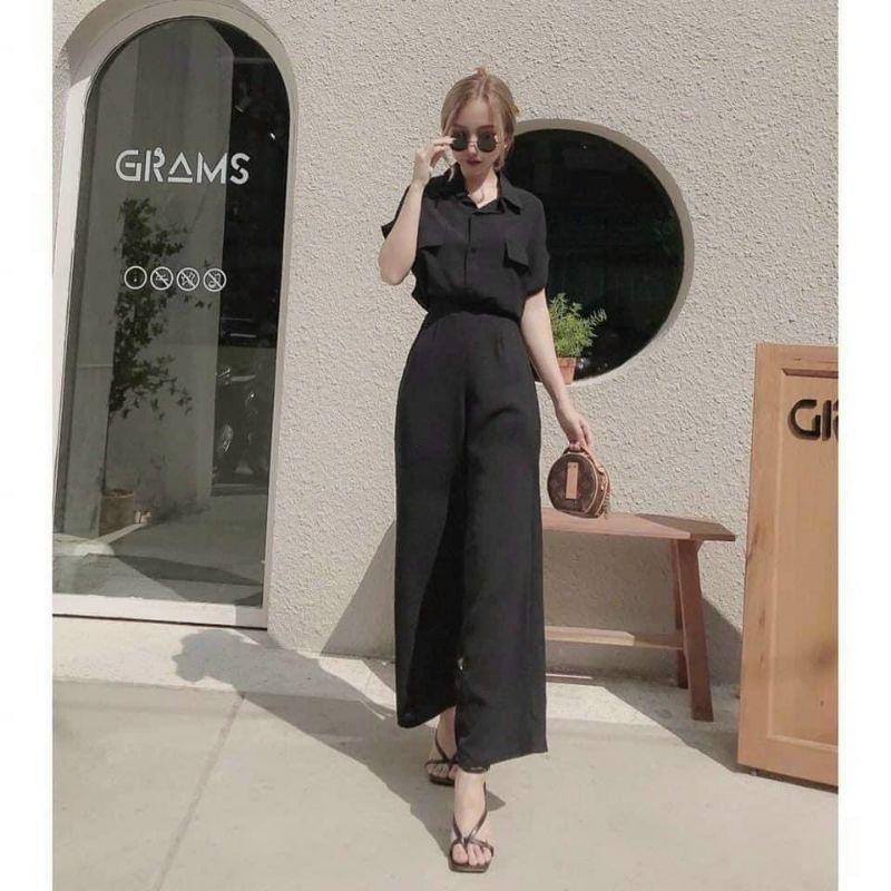 Đồ bộ cổ sơ mi quần ống suông rộng