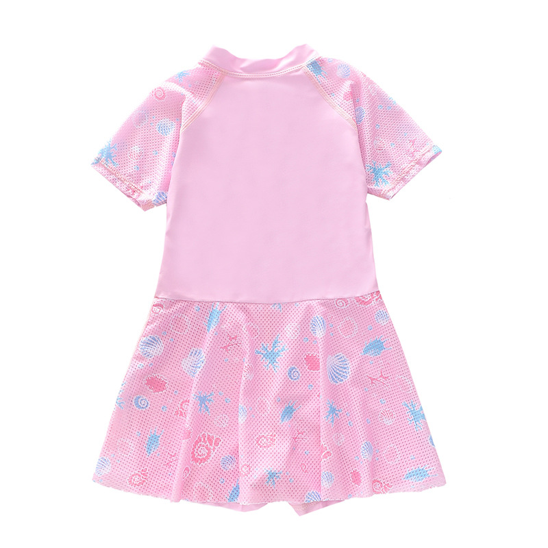 Đồ bơi bé gái thiết kế dáng váy phối hoạ tiết nàng tiên cá, áo tay ngắn zắc lăng vừa vặn vai bé giúp bé dễ dàng vận động cùng chân váy dáng xòe duyên
