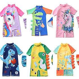 Đồ bơi bé gái, liền thân tay lửng body chống nắng, chất vải mềm mại, họa tiết kỳ lân- búp bê rất được các bé yêu thích. Chất liệu vải thun co dãn tốt, thoát