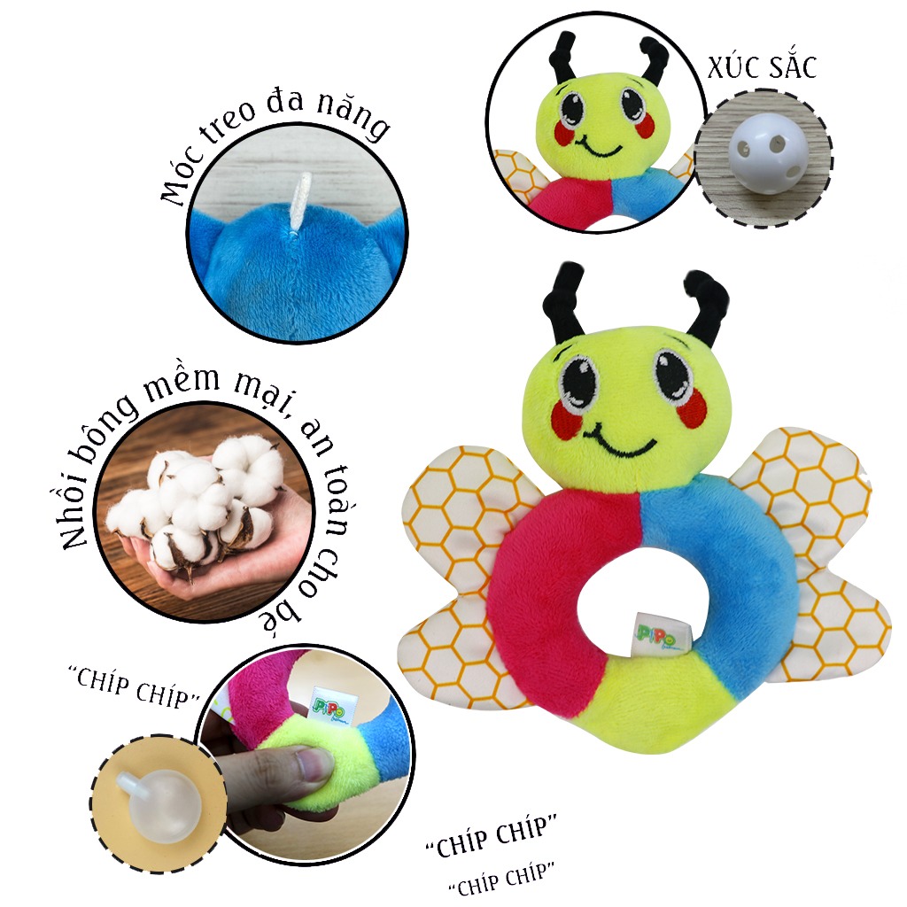 - Lục lạc chuông lớn tạo tiếng kêu leng keng giúp kích thích thính giác thu hút bé khi chơi. Ngoài ra trên lục lạc còn có tiếng kêu sột soạt của màng nylon, tiếng bóp chíp ở bụng lục lạc.