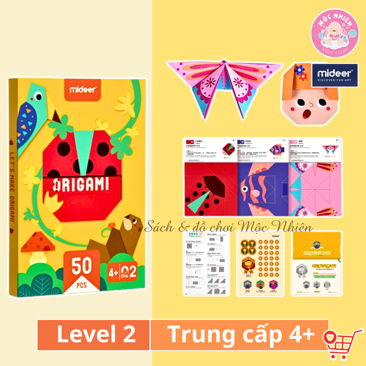 - MD2089 - Bộ gấp giấy origami cấp độ 2 - cho trẻ từ 4 tuổi Kỹ năng gấp đường thẳng nhiều lần, kết hợp gấp đường thẳng, đường xiên và gấp mở nhiều lần