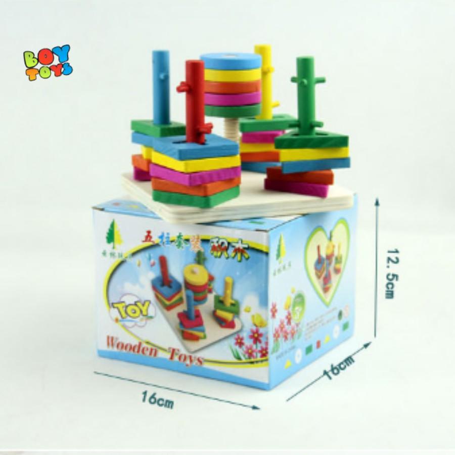 - Bộ đồ chơi xếp hình 5 trụ cột bằng gỗ giúp bé linh hoạt xử lí giữa tay , mắt và bộ não nhờ các trở ngại trên mỗi trụ cột.