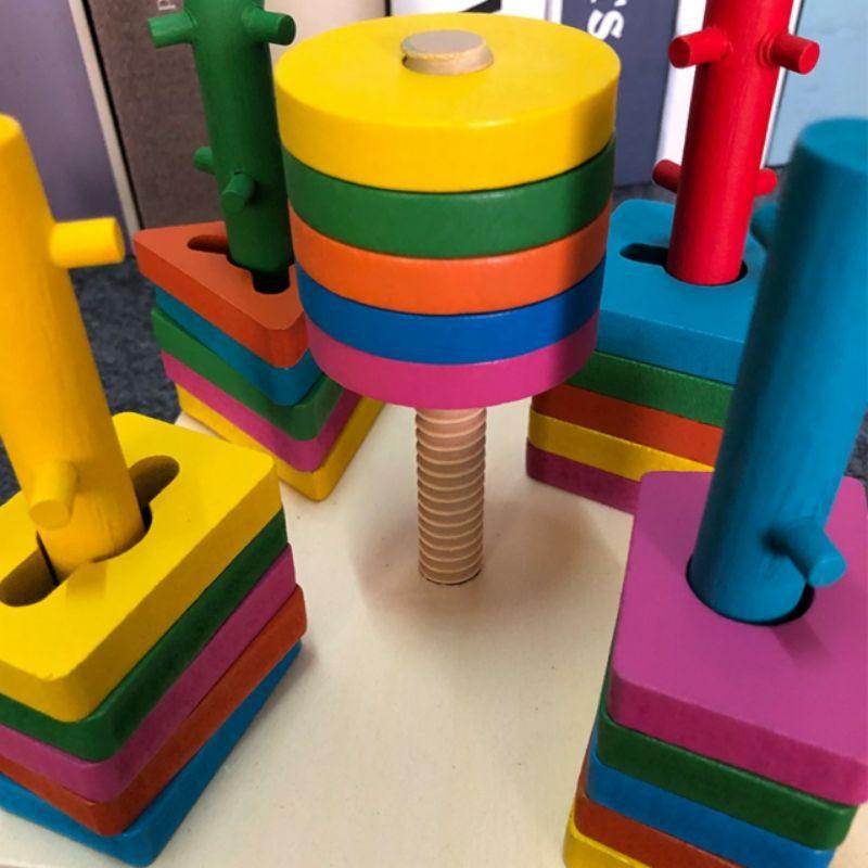 - Bộ đồ chơi xếp hình 5 trụ cột bằng gỗ giúp bé linh hoạt xử lí giữa tay , mắt và bộ não nhờ các trở ngại trên mỗi trụ cột.