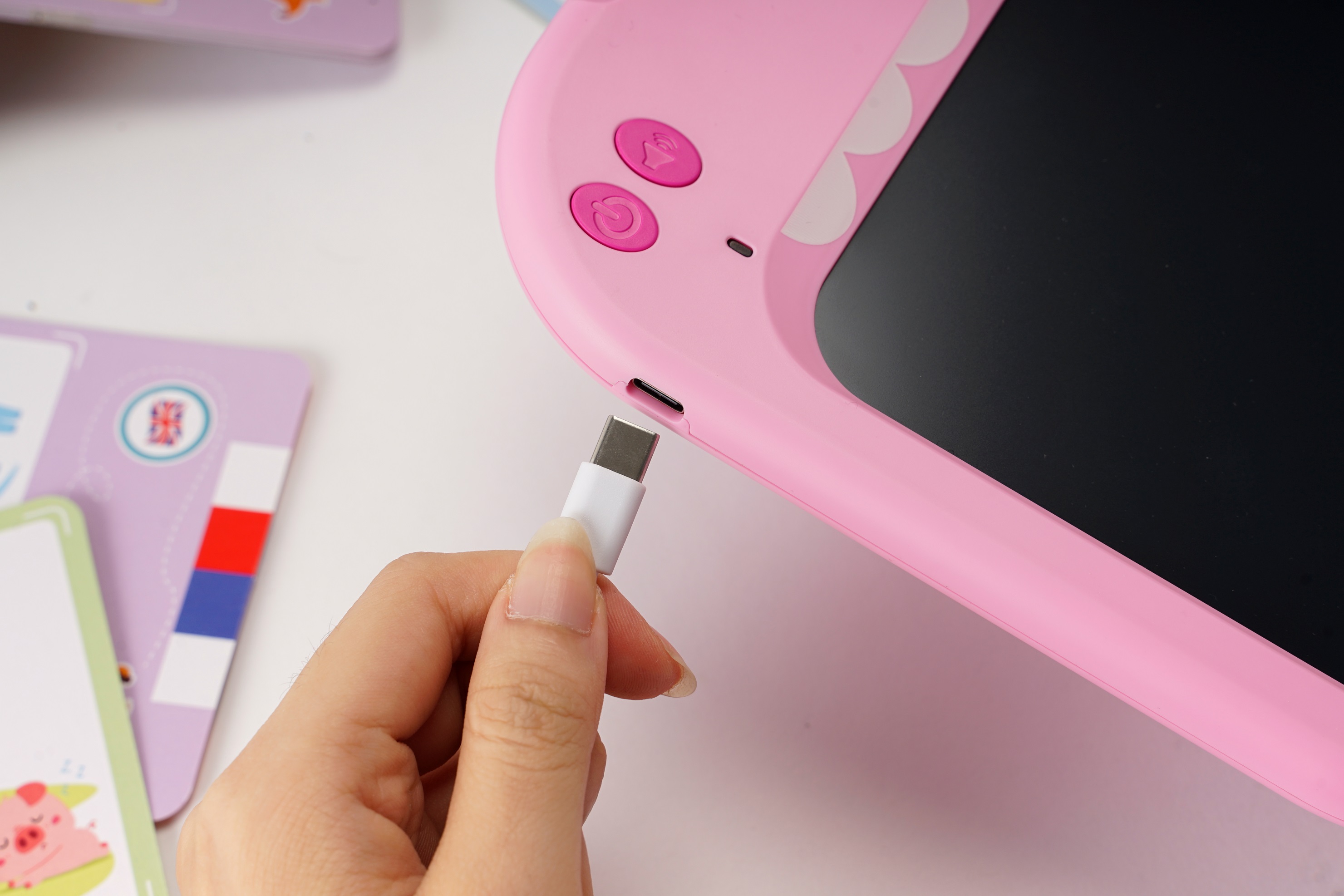 - Chất liệu: Nhựa ABS an toàn, bảng LCD không ánh sáng xanh, thẻ giấy Couche 350 cán bóng HƯỚNG DẪN SỬ DỤNG: Máy đọc thẻ: B1: Bật nút nguồn B2: Chọn thẻ từ bộ thẻ tiếng Anh hoặc tiếng Việt B3: Đưa thẻ vào khe cắm, với mặt nội dung muốn nghe ở phía trên. Đặt lại thẻ vào khe cắm nếu thẻ bị lệch B4: Bấm nút Lặp lại để nghe lại nội dung trên mặt thẻ Bảng viết LCD: