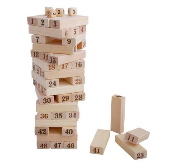 • Mô tả : 48 thanh được khắc số từ 1 đến 48; 4 hạt xí ngầu được khắc số từ 1 đến 4.    Nào chúng ta cùng rút các que gỗ nhỏ ra mà không làm đổ chồng tháp cao này. Giúp trẻ rèn luyện tính cẩn thận và khéo léo. Với trò chơi này, các bé có thể chơi cùng nhau, tinh thần chiến thắng đồng đội sẽ được các bé thể hiện và phát huy. Trò chơi này cũng đang được rất nhiều bạn trẻ ưa chuộng, như một cách thư giãn với bạn bè sau những giờ học tập căng thẳng.   Không chỉ dành cho trẻ em, trò chơi rút gỗ còn giúp giới văn phòng xả stress cực kì hiệu quả sau những giờ làm việc căng thẳng. Bạn có thể giữ món đồ chơi này rất lâu vì nó khá bền.   Bộ trò chơi có kích thước nhỏ gọn nên rất dễ dàng trong việc di chuyển. Bạn có thể mang đi bất cứ đâu bạn muốn để có thể tranh tài cùng bạn bè. Bộ đồ chơi rút gỗ sẽ giúp trẻ rèn luyện tính cẩn thận và khéo léo. Với trò chơi này, các bé có thể chơi cùng nhau, tinh thần chiến thắng đồng đội sẽ được các bé thể hiện và phát huy. Toàn bộ đều làm bằng chất liệu gỗ siêu nhẹ, các mặt được đánh láng mịn, giảm thiểu ma sát nhưng để rút được thanh gỗ ra ngoài mà không làm sập tháp gỗ cũng là cả một vấn đề. Bạn cần phải vận dụng hết sự khéo léo, nhẹ nhàng của mì      Bộ sản phẩm gồm 48 thanh gỗ hình chữ nhật in số từ 1 đến 48 ở hai đầu và 4 hột xí ngầu 6 mặt có in các chữ số từ 1 đến 4. Có thể chơi hai người hoặc nhiều người, dùng xúc xắc để chọn lượt chơi. Người chơi lần lượt đổ xúc xắc và quy định cách rút, sau đó sẽ rút thanh gỗ rồi xếp chồng lên trên. Các cách rút phổ biến là rút số chẵn - lẻ tùy theo nước của xúc xắc là chẵn hay lẻ.