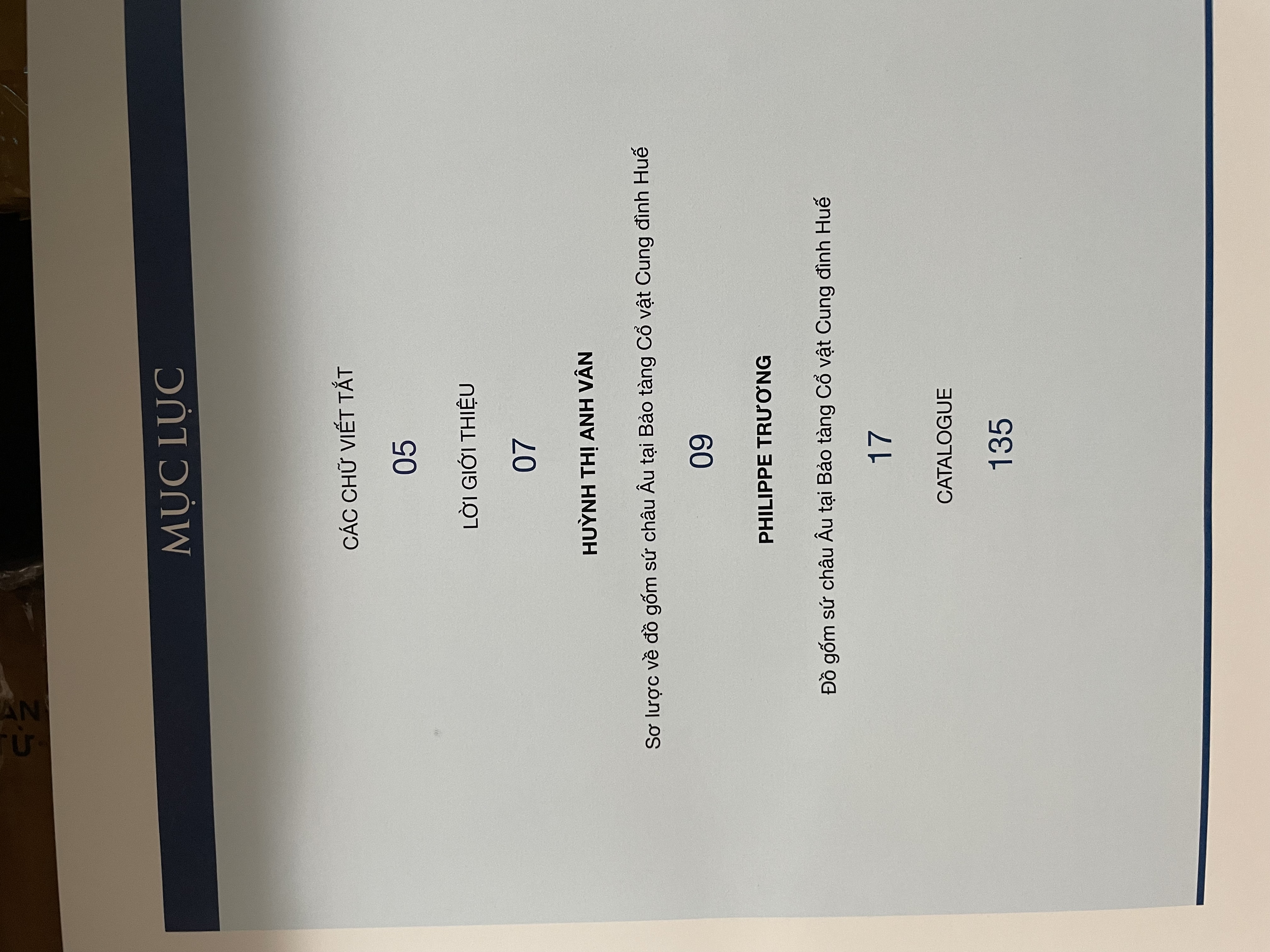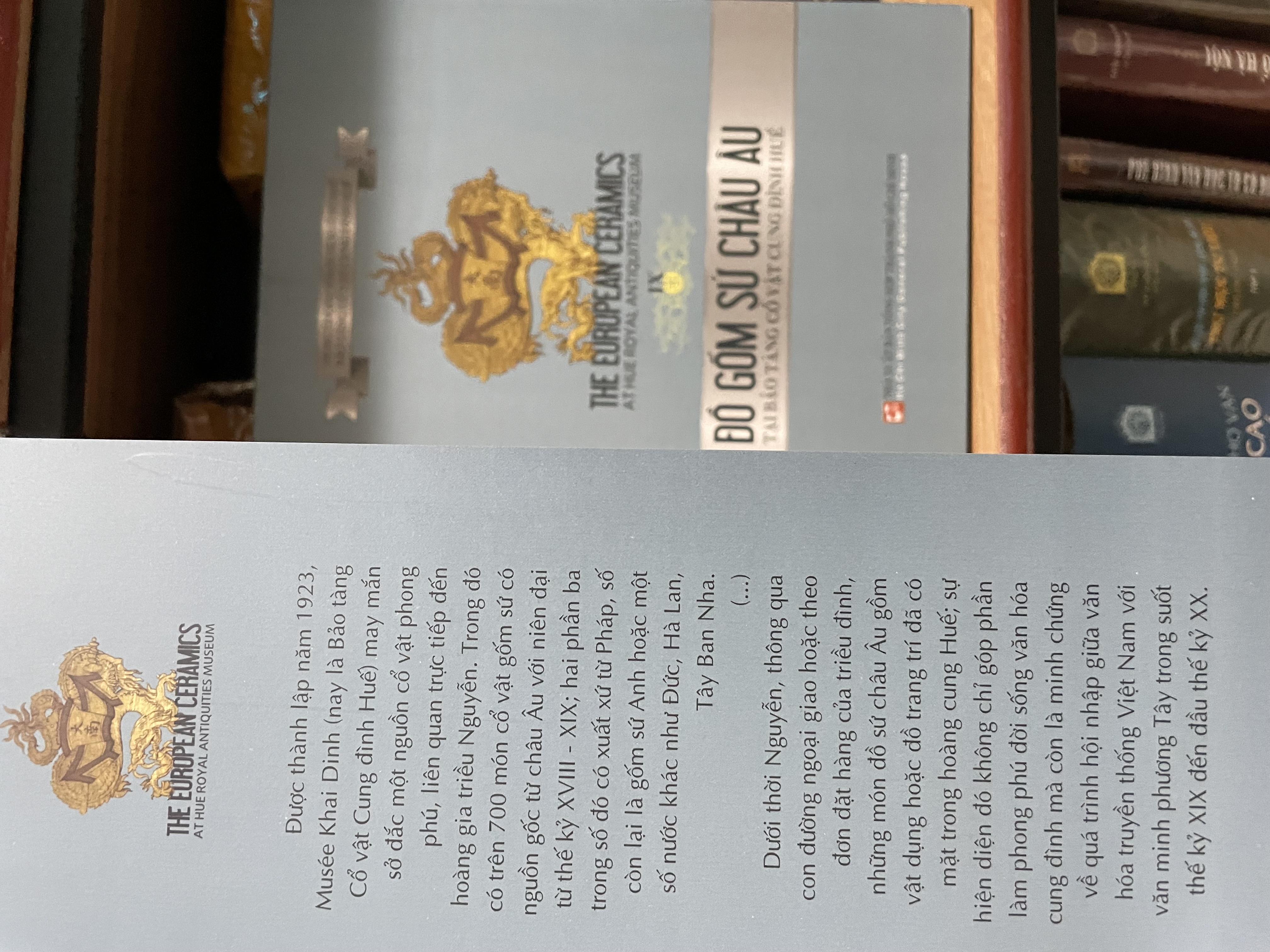 Đồ Gốm Sứ Châu ÂuĐể tiếp cận văn hóa cung đình Huế qua góc nhìn cổ vật, tiếp nối các chuyên đề về sưu tập hiện vật bảo tàng, sách Bảo tàng cổ vật cung đình Huế, tập IX, chuyên đề “Đồ gốm sứ Châu Âu tại Bảo tàng cổ vật cung đình Huế” sẽ giới thiệu đến bạn đọc những thông tin thú vị liên quan đến sưu tập gốm sứ Châu Âu hiện đang lưu giữ tại Bảo tàng này.Từ các nguồn thông tin tư liệu nước ngoài của nhà ngiên cứu Philippe Trương (một chuyên gia giám định cổ vật quốc tế, đồng thời là tác giả của nhiều bài viết, ấn phẩm về đồ gốm sứ Việt Nam đã được công bố ở Việt Nam và nước ngoài), kết hợp với kết quả khảo sát nhóm hiện vật có nguồn gốc Châu Âu tại Bảo tàng cổ vật vật cung đình Huế sẽ mang đến cho độc giả những kiến thức tổng hợp không chỉ liên quan trực tiếp đến nhóm cổ vật mà còn làm sáng tỏ mối liên hệ giữa cổ vật với phong tục tập quán, văn hóa, chính trị, ngoại giao qua từng giai đoạn lịch sử của triều Nguyễn.