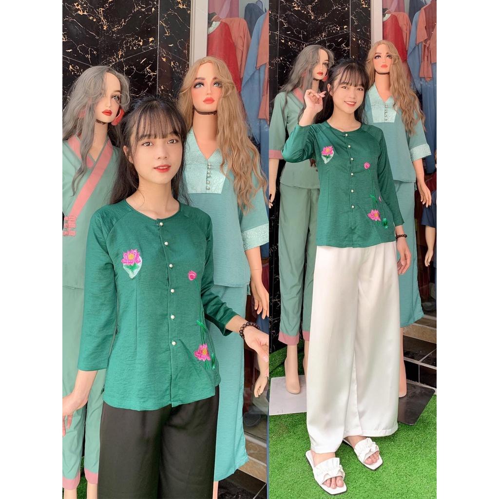 Đồ lam đi chùa - áo xống đi chùa - Đồ lam phật tử - Bộ đồ đi lễ chùa thêu sen cổ tàu (Ảnh + Video cửa hàng tự quay) Bộ đồ lam phật