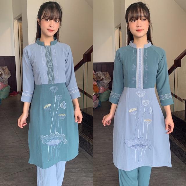 đồ lam đi chùa nữ thêu hoa Cúc cổ V vải đũi thái, Pháp phục lễ chùa, hoa bỉ ngạn