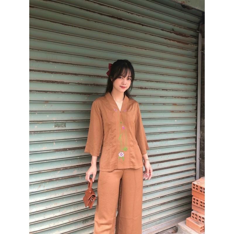 (Ảnh + Video shop tự quay) Bộ đồ lam đi chùa cổ tàu thêu sen gồm cả áo và quần, áo được thêu sen, quần có túi . Size: 24/26/28/30/32/34/36 ( tham khảo bảng chọn