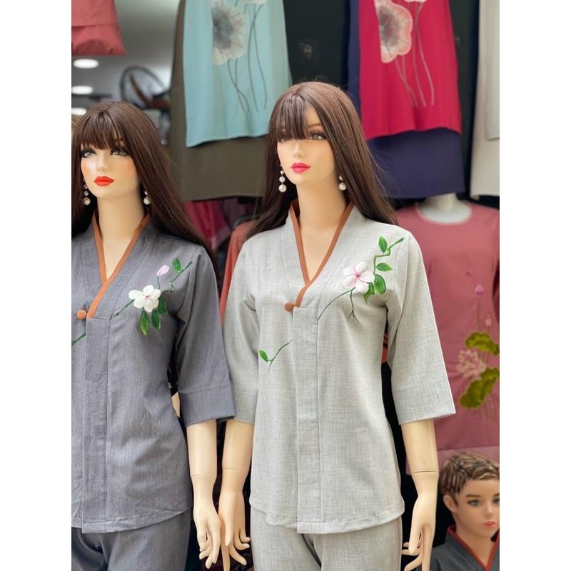 Quần áo đi chùa - Bộ thêu hoa 3D màu trắng - Tâm An Store