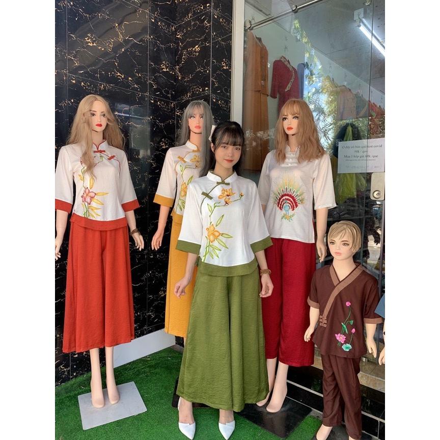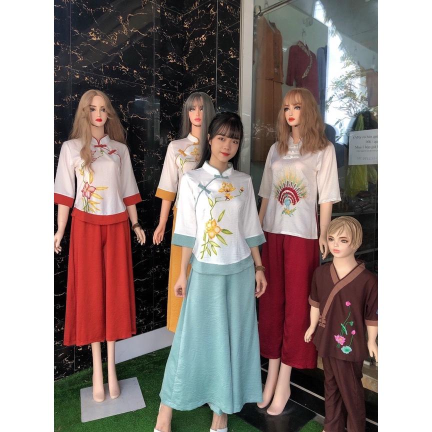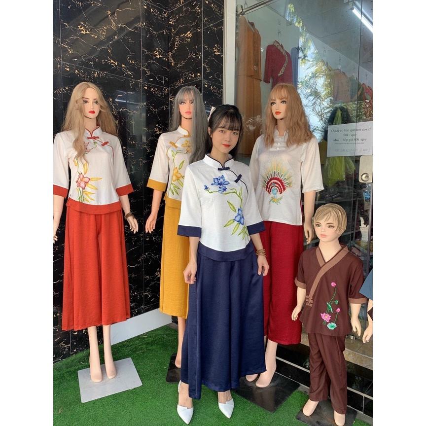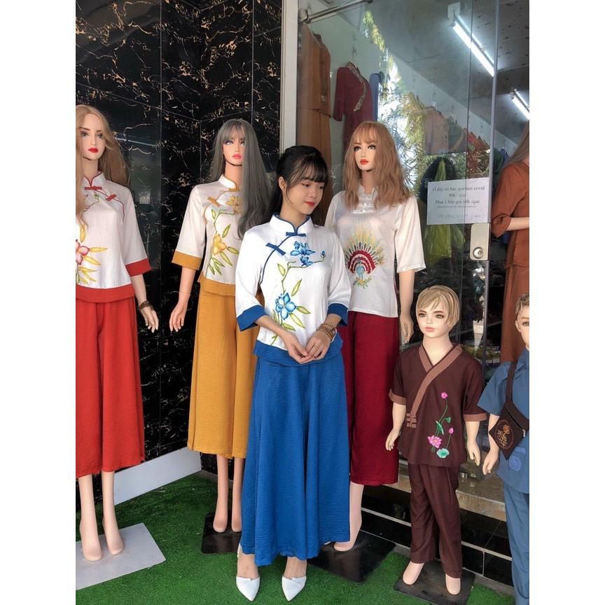 Đồ lam đi chùa - áo xống đi chùa - Đồ lam phật tử - Bộ đồ đi lễ chùa thêu sen cổ tàu (Ảnh + Video cửa hàng tự quay) Bộ đồ lam phật