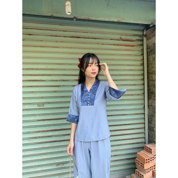 Đồ lam đi chùa - Quần áo đi chùa - Đồ lam phật tử - Bộ đồ đi lễ chùa thêu sen cổ tàu (Ảnh + Video shop tự quay) Bộ đồ lam phật tử