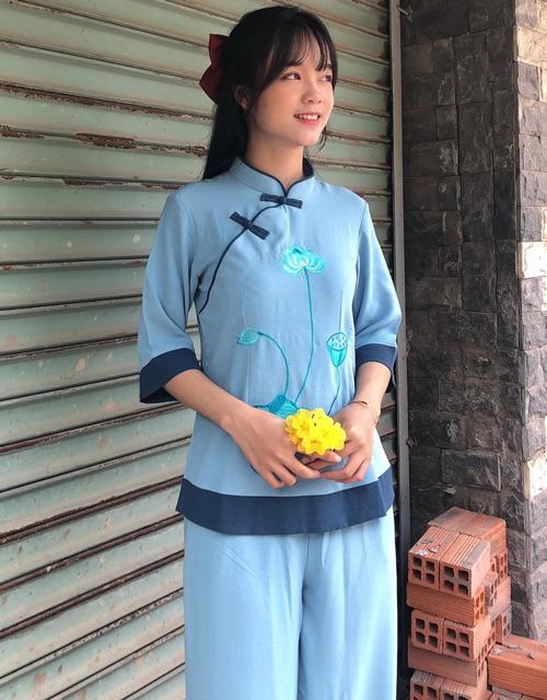 Đồ lam đi chùa - Quần áo đi chùa - Đồ lam phật tử - Bộ đồ đi lễ chùa thêu sen cổ tàu (Ảnh + Video shop tự quay) Bộ đồ lam phật tử