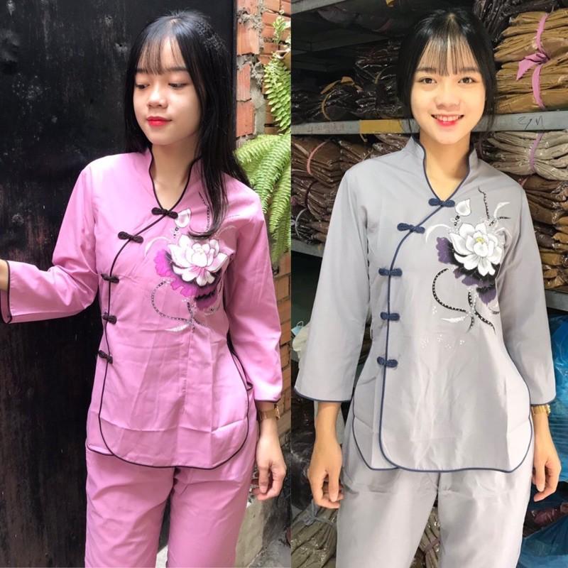 [ FREE SHIP ] Bộ đồ lam đi chùa nữ thêu sen chất liệu đũi thái, Pháp phục lễ chùa cổ tàu phối