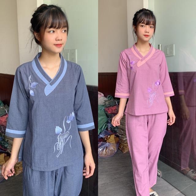 Đồ lam đi chùa - Quần áo đi chùa - Đồ lam phật tử - Bộ đồ đi lễ chùa thêu sen cổ tàu (Ảnh + Video shop tự quay) Bộ đồ lam phật tử