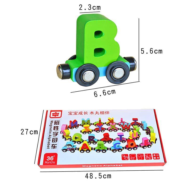 - Sơn màu đẹp mắt, mịn, ko có hiện tượng bong tróc sơn. Đoàn tàu chữ: Gồm có 27 toa tàu trong đó có 1 toa đầu tàu, và 26 toa là chữ cái. Đoàn tàu số và phép tính: gồm 27 toa, 1 toa đầu tàu, các toa số 0-20 kèm các toa phép tính +-x/= ĐẶC BIỆT, giữa các toa được nối với nhau bằng lực hút nam châm cực kì chắc chắn . Khi chơi sẽ giúp con: