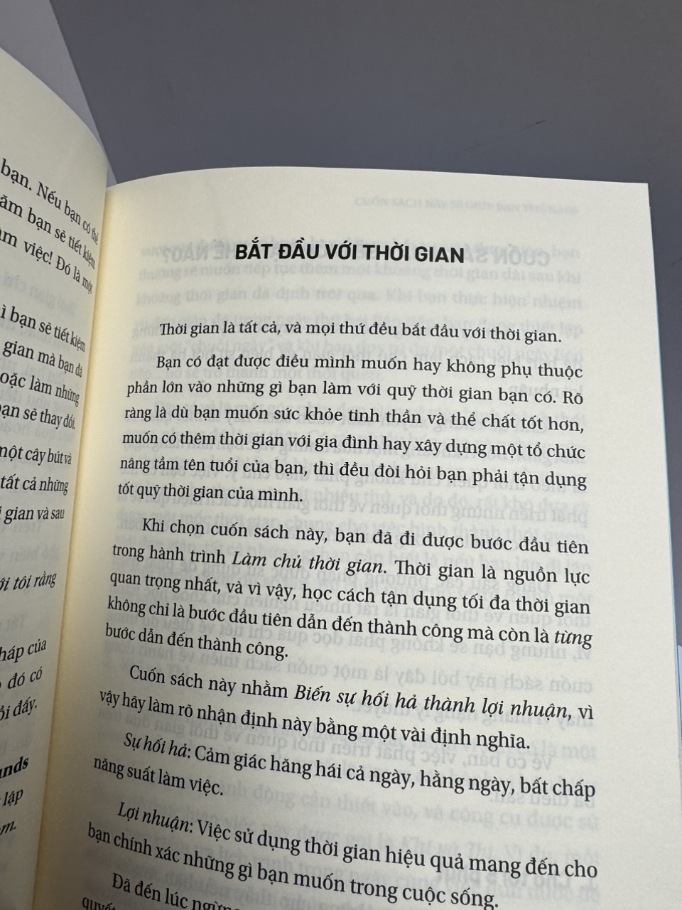 Bên cạnh đó, tác giả cũng chỉ ra được hai vấn đề của thời gian. Thứ nhất, thời gian không bao giờ là đủ. Thứ hai, những việc bạn cần làm để tận dụng thêm thời gian dường như đều không hiệu quả bởi ta không thể thay đổi được thời gian. Từ đó, tác giả đưa ra gợi ý giúp chúng ta áp dụng những phương pháp mới để thích ứng với thời gian một cách hiệu quả nhất.