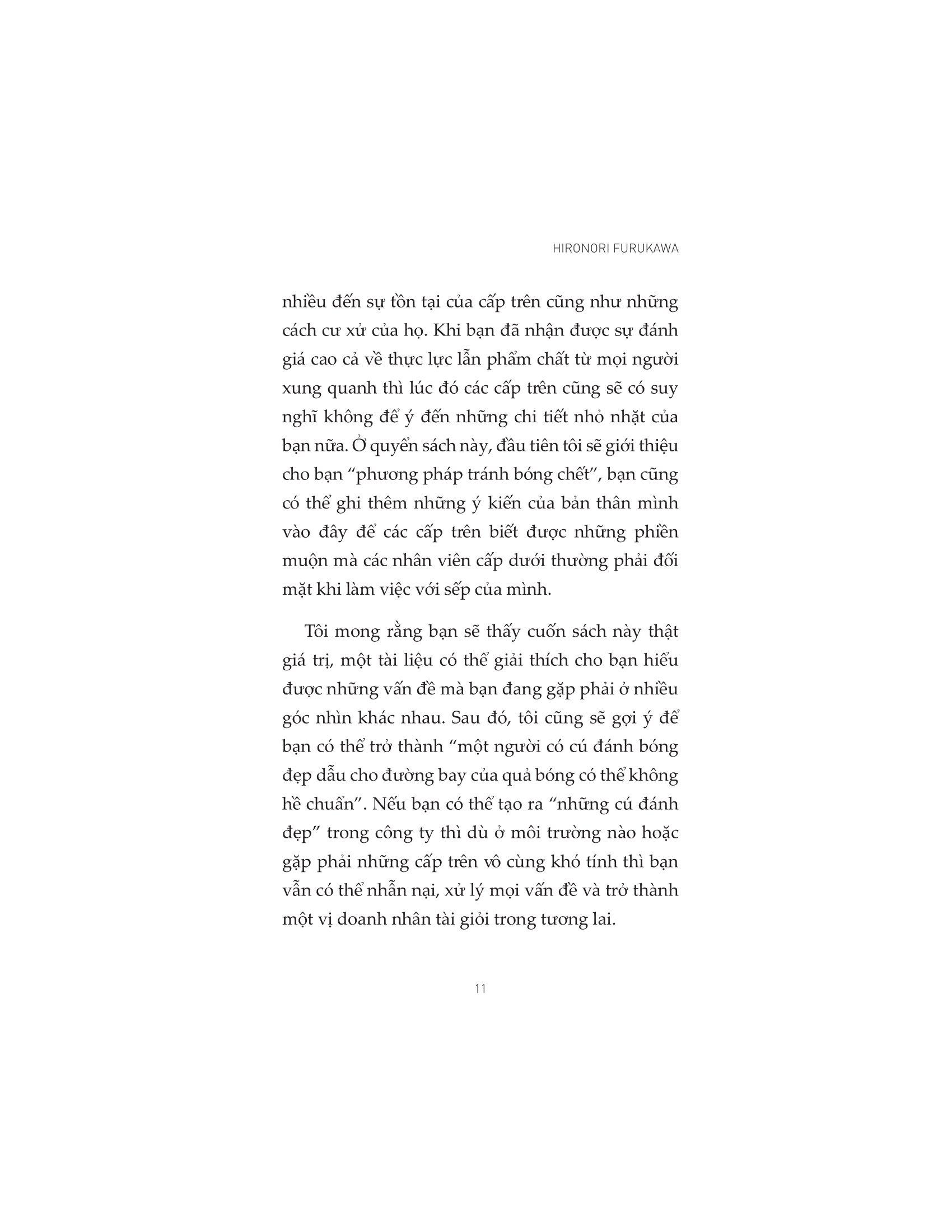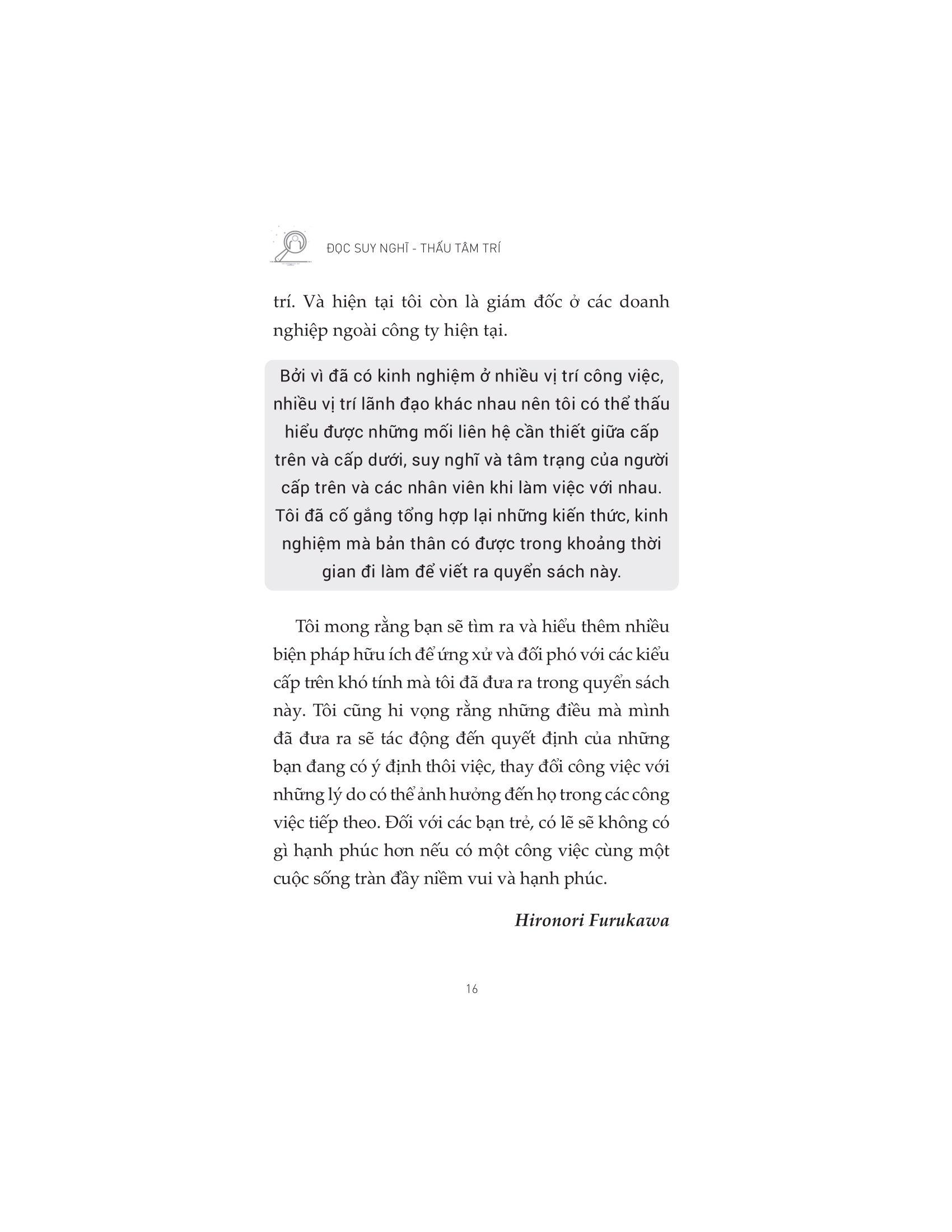 - Không tìm thấy định hướng nghề nghiệp khi làm ở công ty đó Bởi ở bất kỳ công ty nào cũng có các vị sếp “đáng sợ”, vậy nên việc rèn luyện kỹ năng giao tiếp nơi làm việc sẽ giúp các nhân viên trẻ mới đi làm không còn cảm thấy áp lực hay sợ hãi khi làm việc leader. Bên cạnh đó, tác giả cũng hướng dẫn các nhân viên cấp dưới các kỹ năng để nâng cao năng lực bản thân, chủ động trong công việc, tạo dựng được sự tín nhiệm và ủng hộ từ đồng nghiệp và xây dựng mối quan hệ làm việc hiệu quả với các cấp trên và tận hưởng công việc mỗi ngày của m.ình. “Đọc suy nghĩ – Thấu tâm trí” sẽ là tài liệu bổ ích giúp bạn đọc có cài nhìn nhiều chiều hơn về môi trường công sở để từ đó trang bị cho bản thân những kiến thức và kỹ năng cần thiết. Về tác giả: Hironori Furukawa sinh năm 1954 tại Ikeda, Osaka. Ông tốt nghiệp Khoa Thương mại tại Đại học Waseda. Quen thuộc với độc giả về các đề tài mối quan hệ cấp dưới – cấp trên và phát triển nguồn nhân lực, ông hoạt động như một người hướng dẫn đào tạo. Ông tập trung vào cải cách văn hóa doanh nghiệp, nâng cao nhận thức cho người làm kinh doanh và tạo động lực làm việc cho cấp dưới….