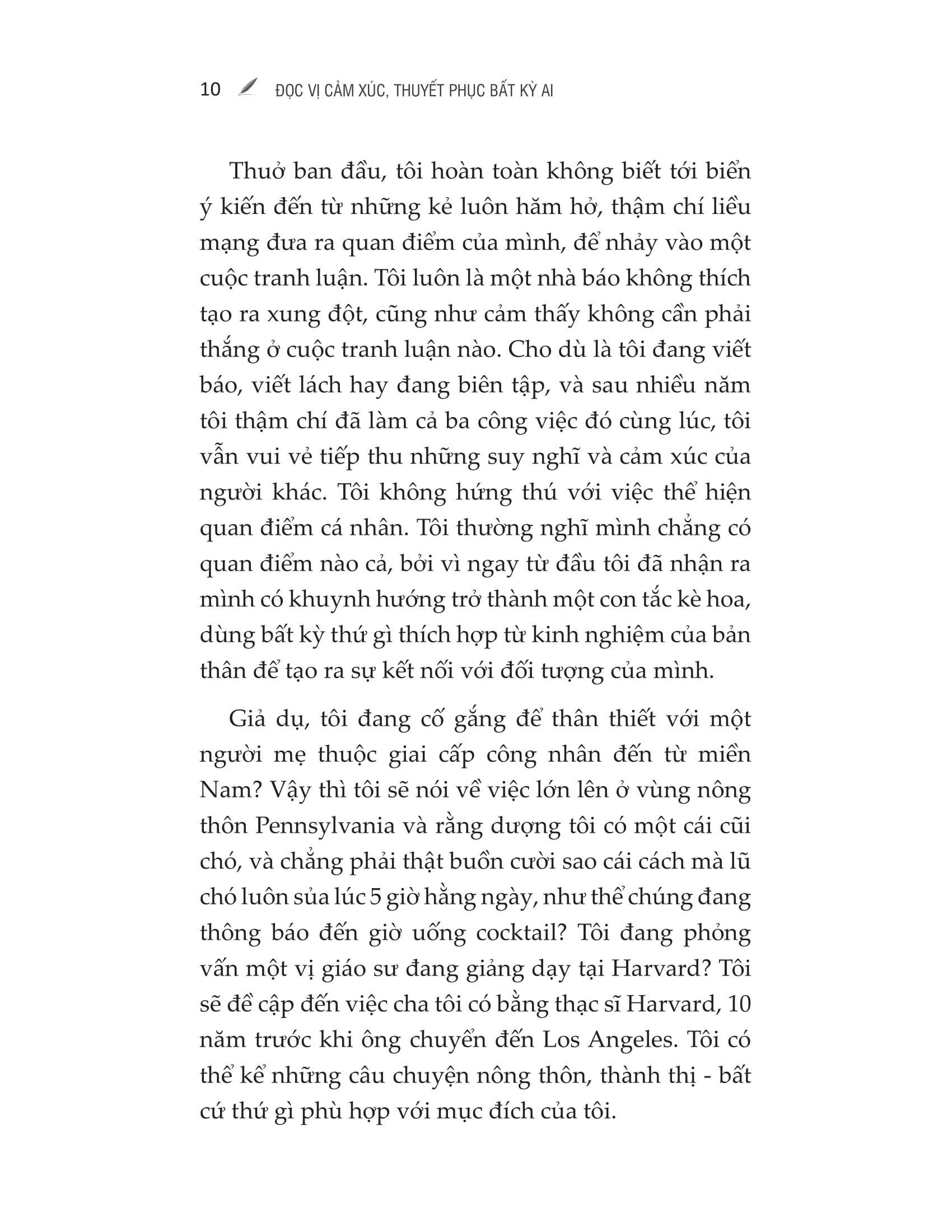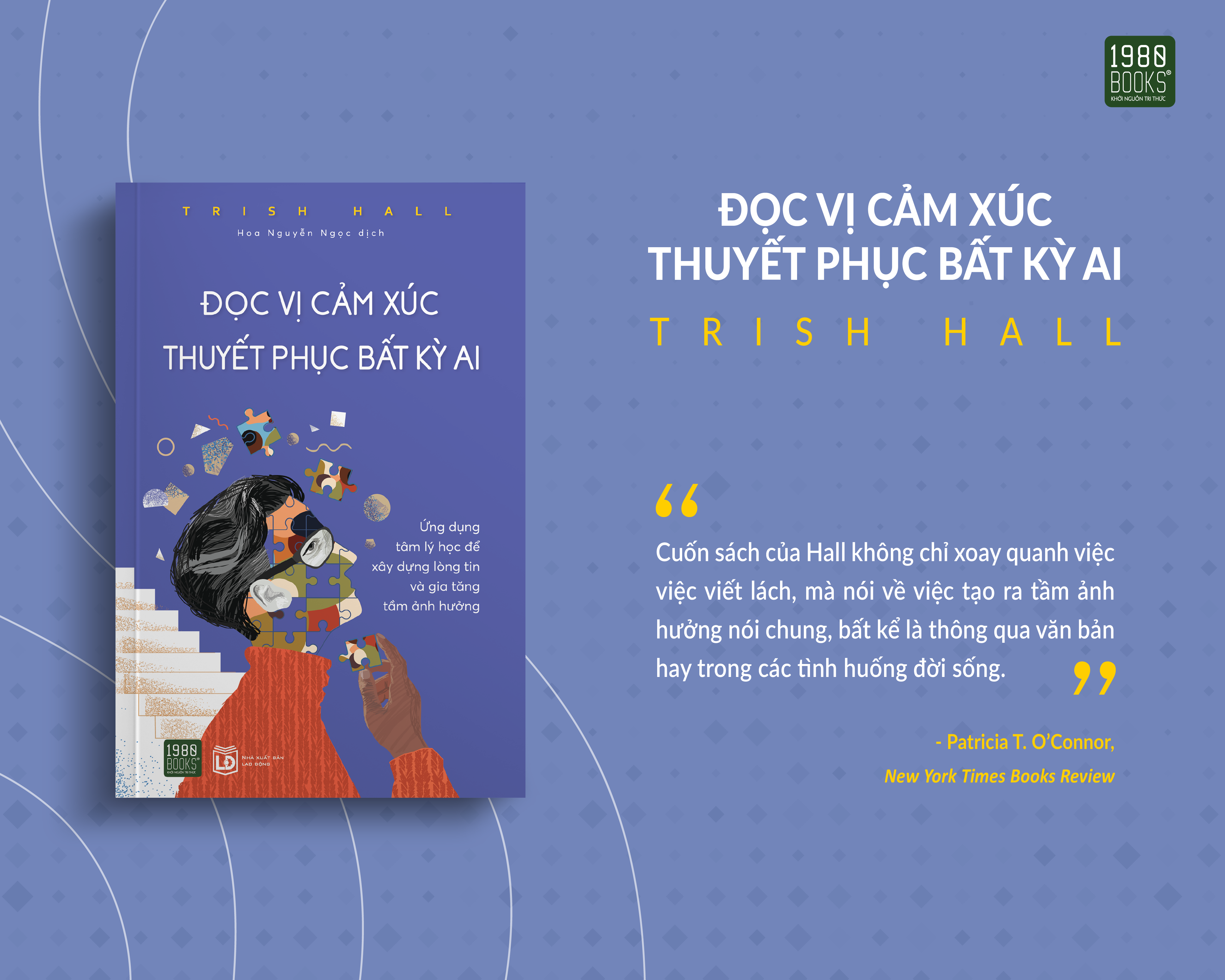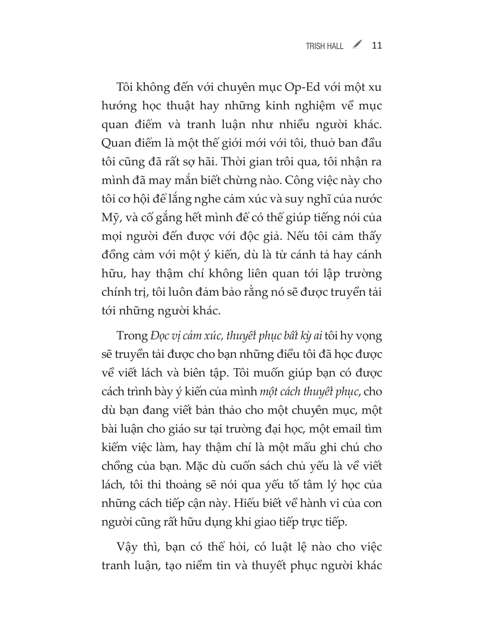 Là người phụ trách mục Góc nhìn cho tờ New York Times, tác giả Trish Hall đã dành nhiều năm đắm chìm trong những cuộc tranh luận và những bài viết thể hiện quan điểm. Trong quá trình đó, cô thường xuyên phải tiếp xúc với những câu văn rối rắm, những biệt ngữ khó hiểu và những bài viết chán ngắt. Dựa trên kinh nghiệm m.ình, Trish Hall đã viết “Đọc vị cảm xúc, thuyết phục bất kỳ ai” để giúp người đọc giao tiếp một cách hiệu quả và thu phục lòng người.