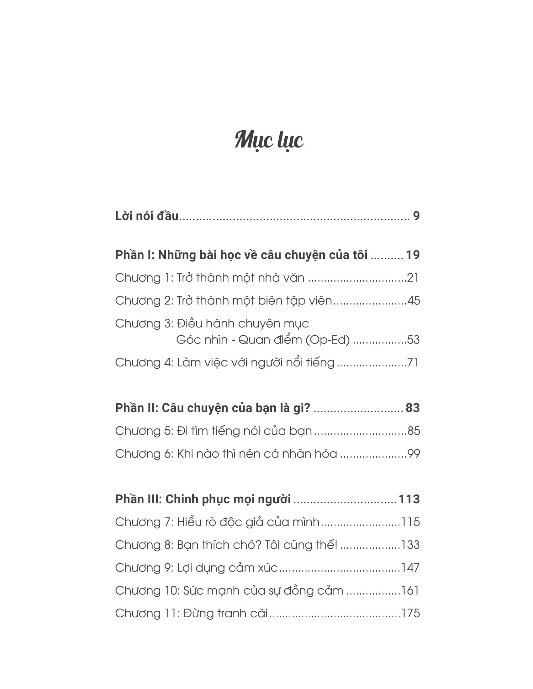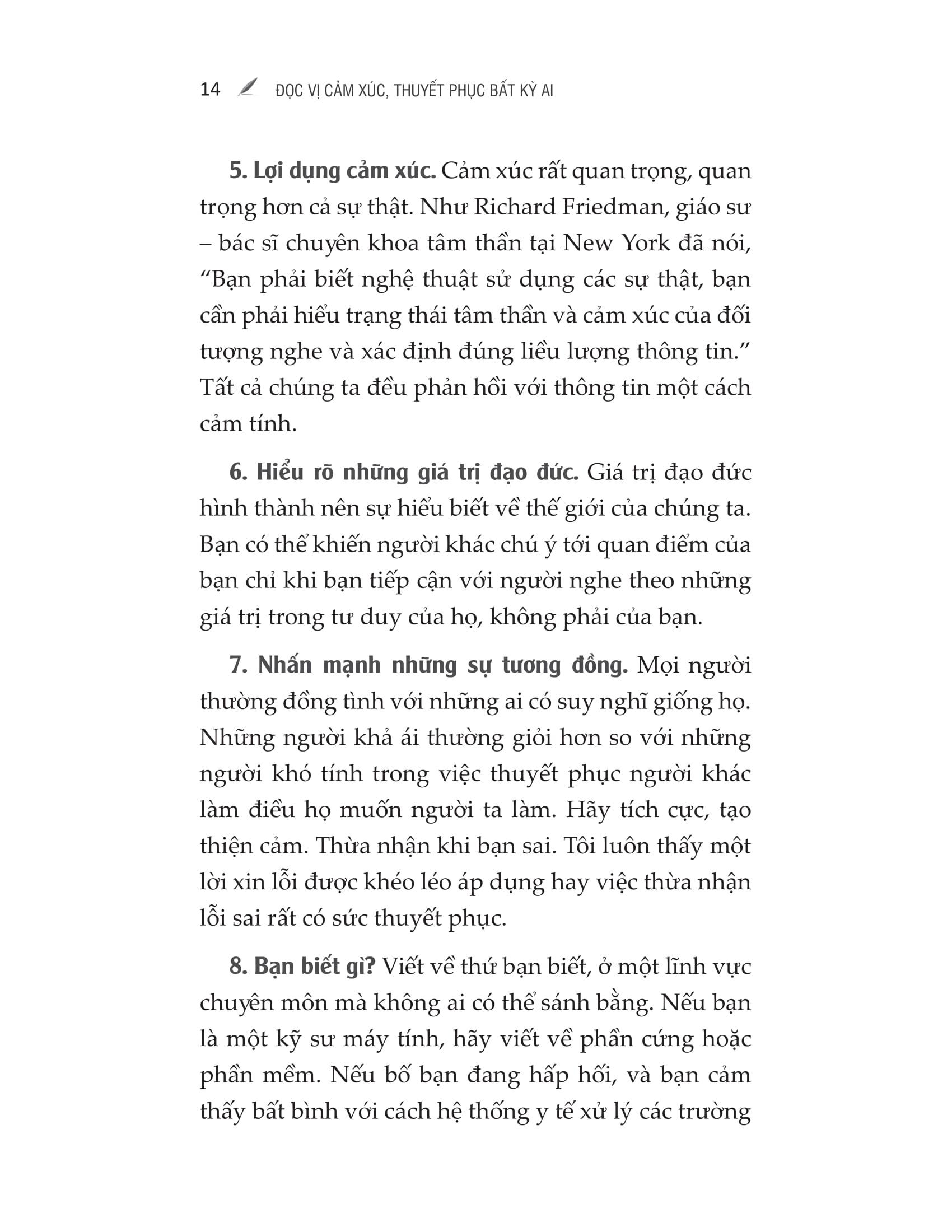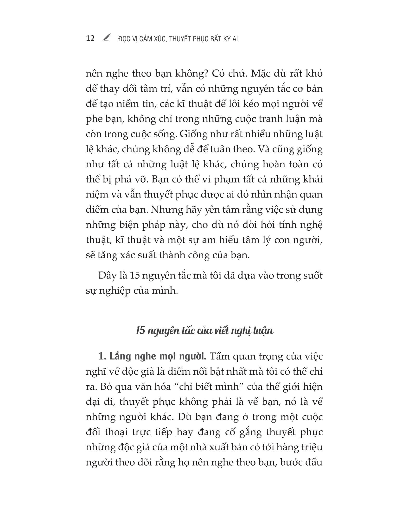 Là người phụ trách mục Góc nhìn cho tờ New York Times, tác giả Trish Hall đã dành nhiều năm đắm chìm trong những cuộc tranh luận và những bài viết thể hiện quan điểm. Trong quá trình đó, cô thường xuyên phải tiếp xúc với những câu văn rối rắm, những biệt ngữ khó hiểu và những bài viết chán ngắt. Dựa trên kinh nghiệm m.ình, Trish Hall đã viết “Đọc vị cảm xúc, thuyết phục bất kỳ ai” để giúp người đọc giao tiếp một cách hiệu quả và thu phục lòng người.