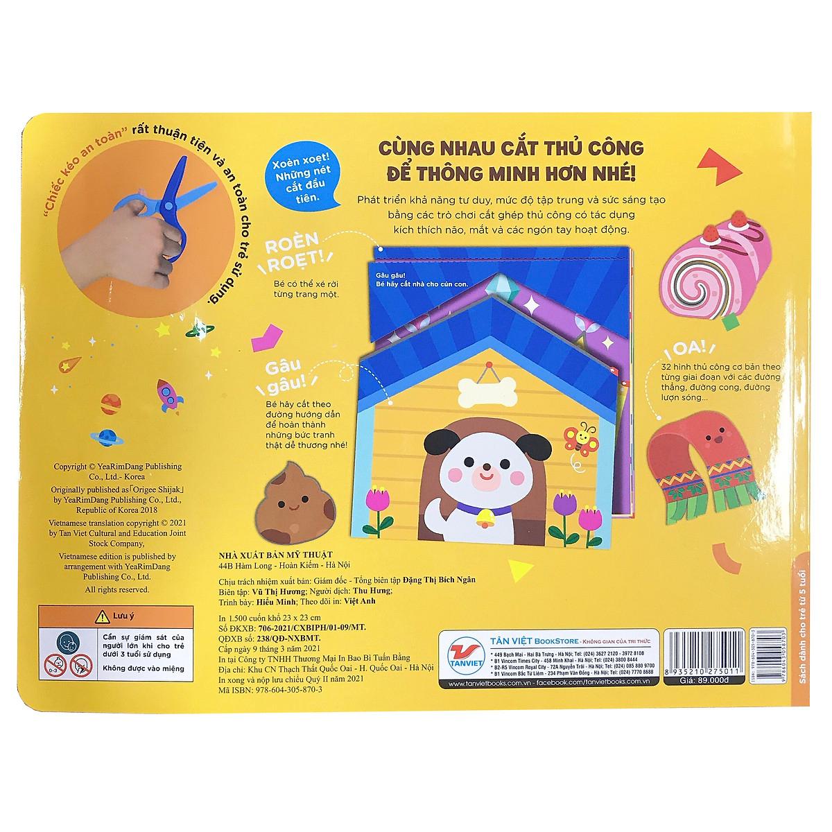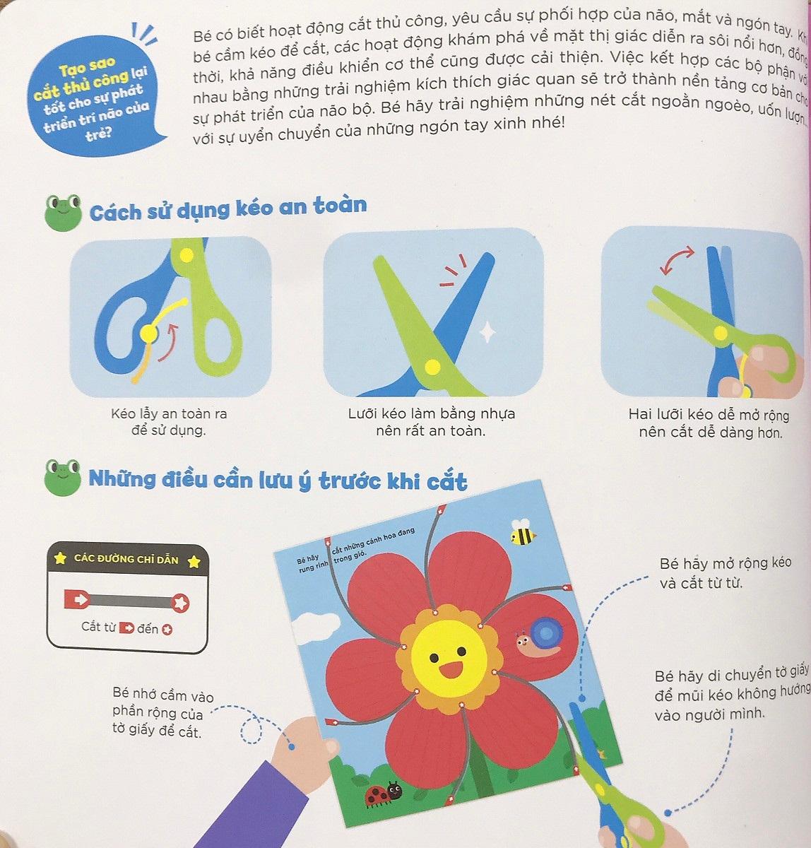 Mua tại TiktokĐôi bàn tay khéo léo là bộ sách thủ công tương tác dành cho các bé từ 3 tuổi trở lên. Hoạt động cắt thủ công yêu cầu sự phối hợp của não, mắt và các ngón tay. Khi bé cầm kéo để cắt, các hoạt động khám phá về mặt thị giác diễn ra sôi nổi hơn, đồng thời hơn, khẳ năng điều khiển cơ thể được cải thiện. Việc kết hợp các bộ phận với nhau bằng những trải nghiệm kích thích giác quan sẽ trở thành nền tảng cơ bản cho sự phát triển của não bộ.
