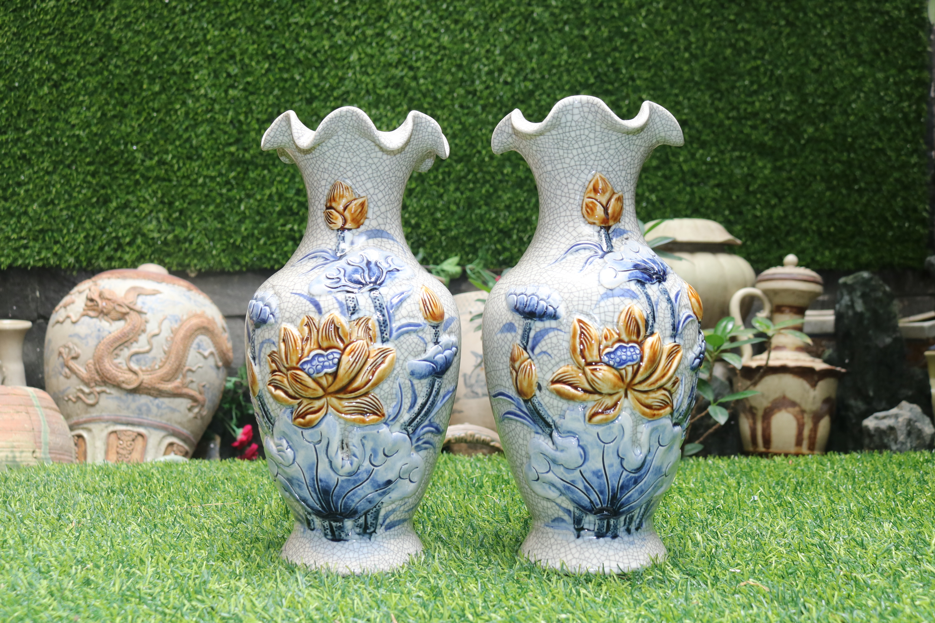 ✨Đôi lọ hoa men rạn đắp nổi sen dáng miệng lượn