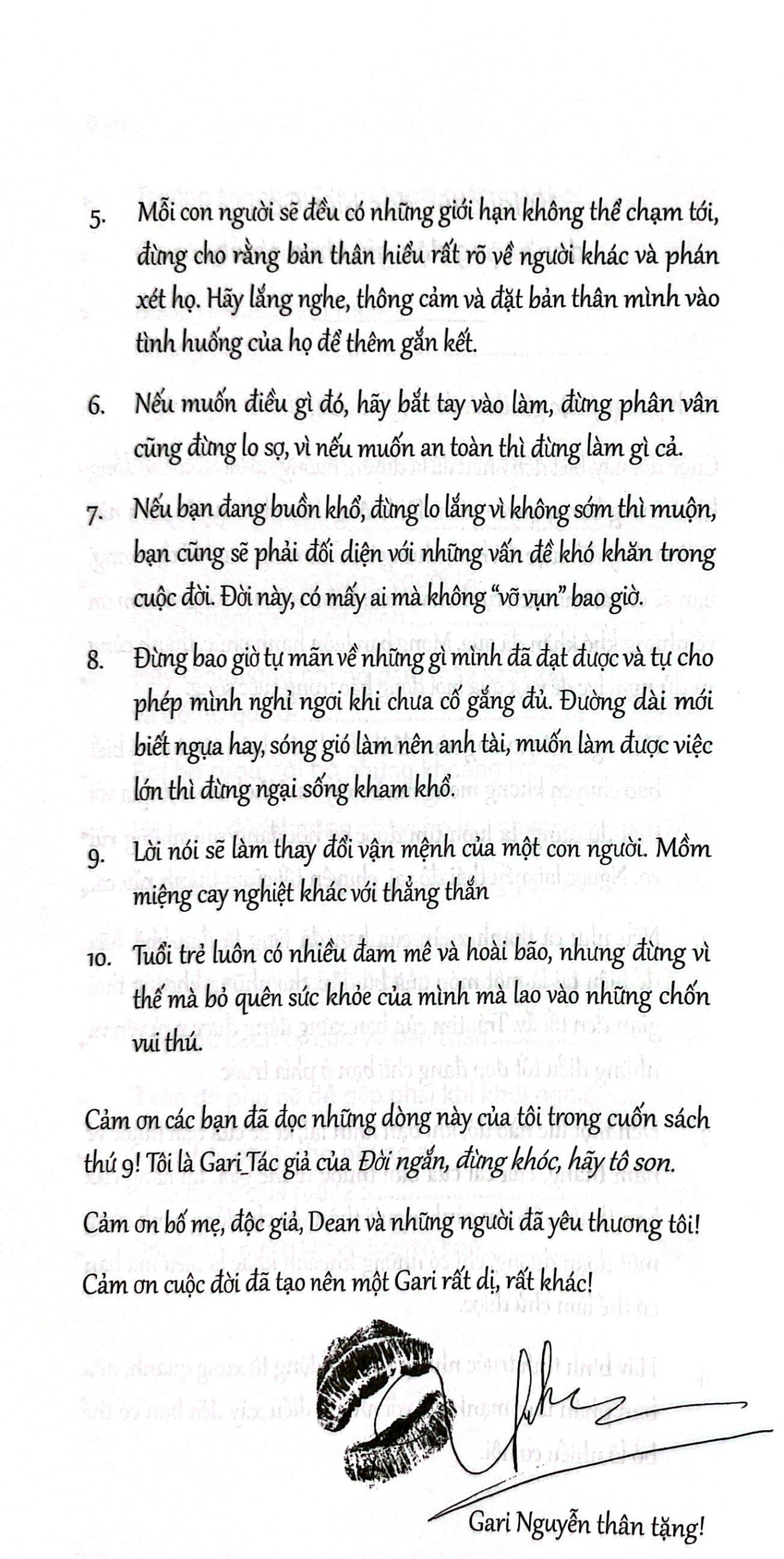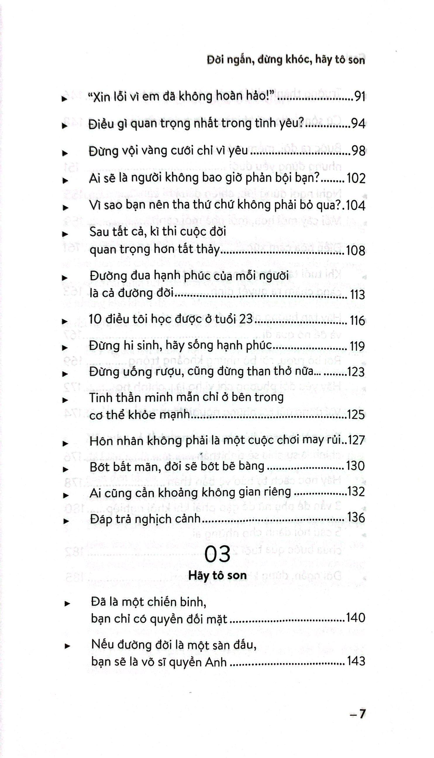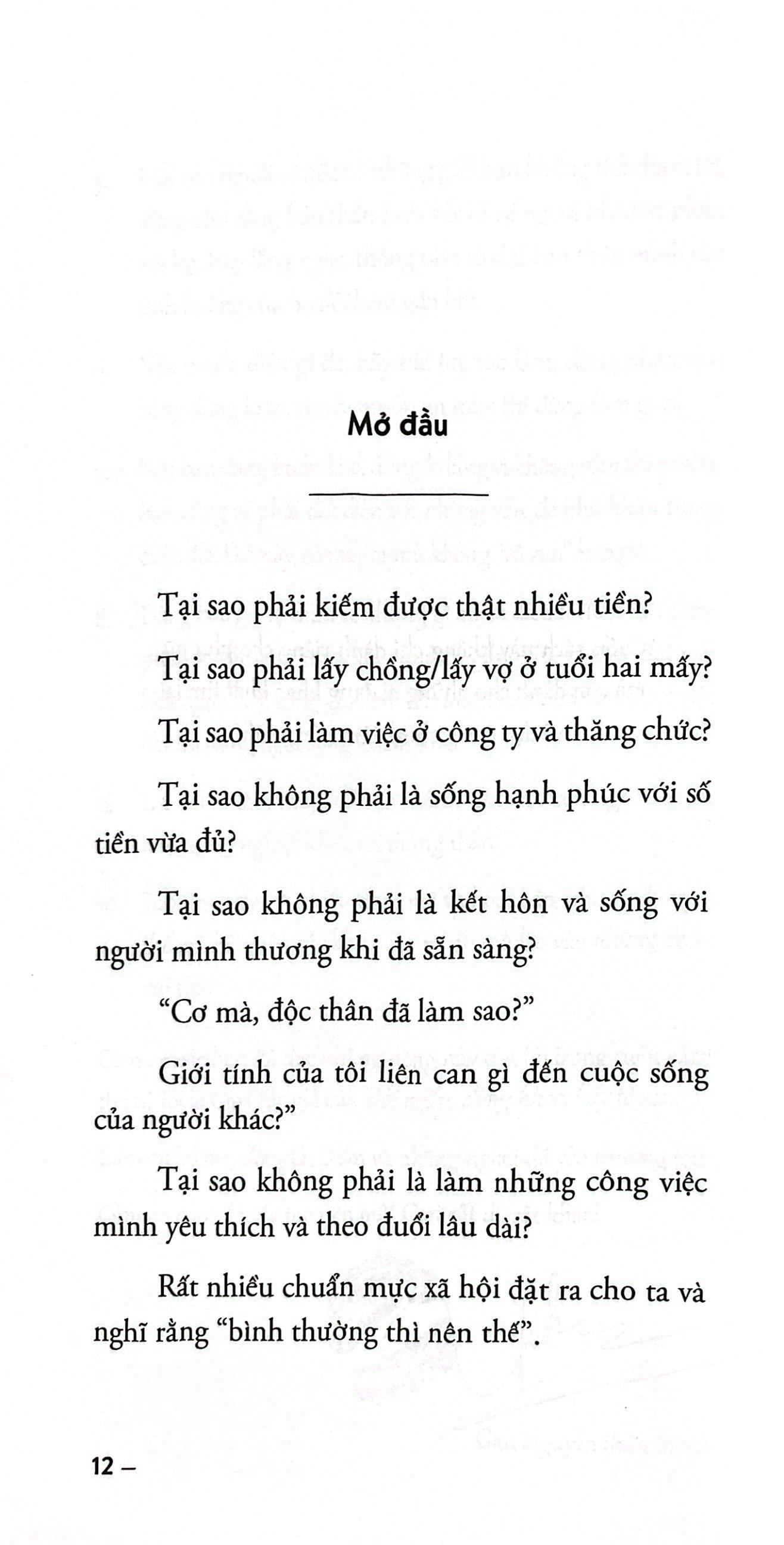 - Tại sao không phải là sống hạnh phúc với số tiền vừa đủ? Vô vàn những câu hỏi đặt ra dành cho những ai đi bước vào tuổi trẻ. Không còn đơn giản là những câu hỏi ai-cũng-hỏi, chẳng biết tự bao giờ trở thành những quy chuẩn của xã hội áp lên những con người đang sống trong đó. Một khi bạn xác định bạn là ai, bạn không giống đám đông cho rằng “ai cũng như m.ình” ngoài kia, bạn sẽ không phải tuân theo những quy chuẩn của xã hội để “sống tốt”, mà bạn sẽ “sống hạnh phúc” với những lựa chọn của m.ình. Khi ấy, mục tiêu “có được bao nhiêu thứ trước tuổi 30”, trong mắt bạn, chỉ là một góc nhìn, không phải là tiêu chuẩn. Khi ấy, hạnh phúc không phải là những gì bạn đạt được, mà là những gì bạn lựa chọn, bởi bạn không giống đám đông. Muốn thật sự hạnh phúc, hãy học cách yêu thương bản thân m.ình để có thể đi xa trên đường đời. Trước khi có thể lo cho người khác, hãy tự biết cách giải quyết vấn đề của m.ình. Muốn được đời đối xử tốt, hãy trở thành một người có giá trị, bạn nhé! Đời ngắn lắm, các cô gái à! Đừng khóc, hãy tô son để tiếp tục chiến đấu và sống theo cách của bạn. Cuốn sách này không chỉ dành riêng cho phụ nữ, mà còn dành cho những ai đang khao khát tìm lại vẻ đẹp trong chính tâm hồn m.ình. Những "triết lý" đời thường truyền cảm hứng cho người đọc biết sống vì m.ình và chăm sóc tốt cho bản thân.