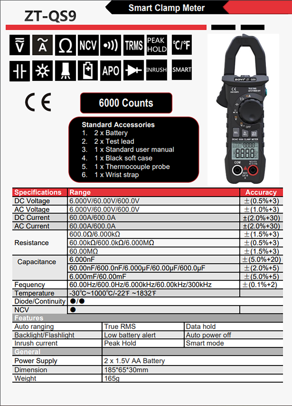 Đồng hồ Zoyi ZT-QS9 đo điện vạn năng TRMS 6000 số đếm, bộ kẹp khởi động kỹ thuật số, đo dòng điện AC/DC, đo chống nhiễu trở kháng, tính liên tục NCV, lưu giữ dữ liệu, đo RMS thựcThông số kỹ thuật:...