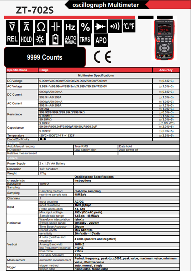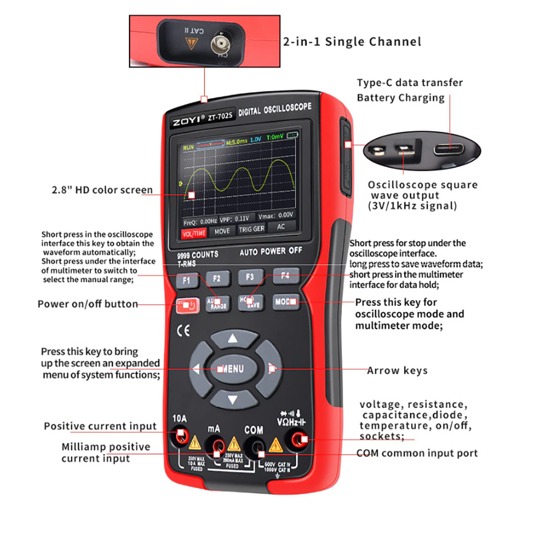 Đồng hồ đo điện kết hợp đo sóng ABG ZT-702S máy hiện sóng, đồng hồ đo điện, đo sóng, màn hình IPS 2,8 inch, băng thông 10 MHZ, tốc độ lấy mẫu thời gian thực 48MSa/s, số đếm 9999, dành cho giáo dục phổ thông, bảo dưỡng ô tô, phát hiện điện, và sửa chữa tinh vi