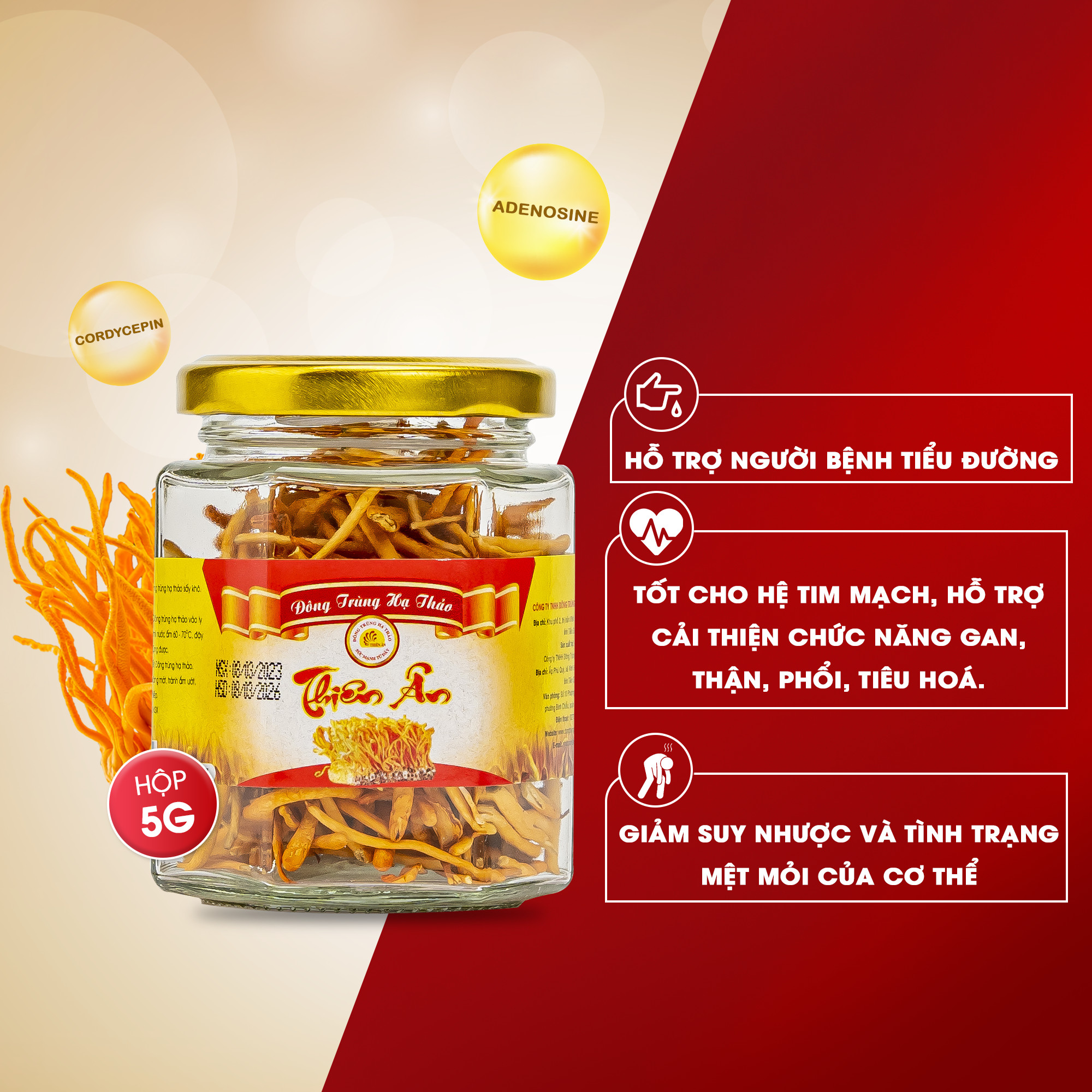 Mua tại TiktokĐông trùng hạ thảo sấy thăng hoa Thiên Ân 5 gram là sản phẩm được sấy thăng hoa từ đông trùng hạ thảo tươi, đảm bảo giữ được 99% hàm lượng dược chất. Quy cách đóng gói: Hũ thủy tinh 5g Sản phẩm được cấp chứng nhận Hàng Việt Nam Chất Lượng Cao do Hội Doanh Nghiệp Hàng Việt Nam Chất Lượng Cao cấp. Sản phẩm đạt tiêu chuẩn FDA xuất khẩu sang Mỹ