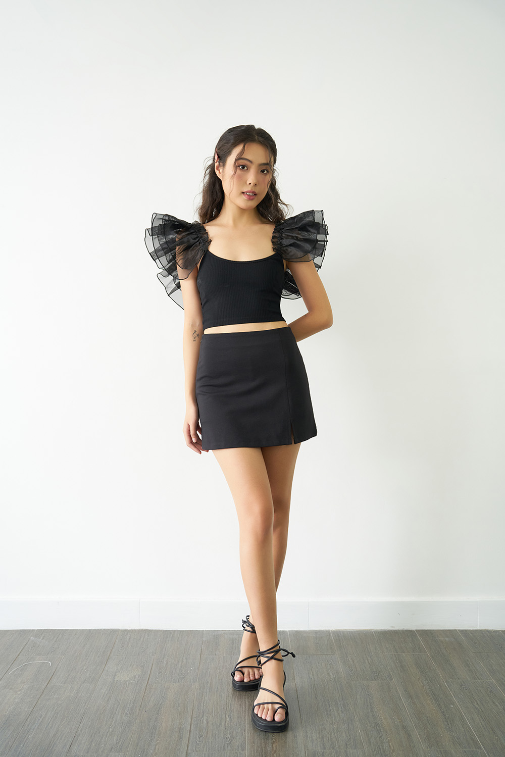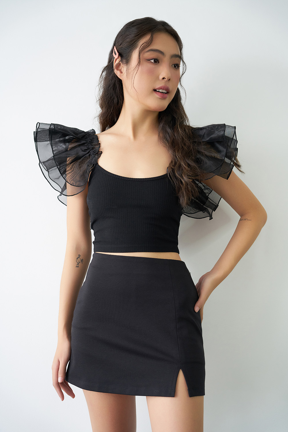 DOTTIE - Áo phối vải tay cánh tiên - Đen - T0707 - Màu sắc sản phẩm: Đen - Chất liệu: Thun phối organza - Đặc tính: Co giãn nhẹ, thoáng mát - Lưu ý giặt ủi: Giặt tay/ máy. - Size: S, M STT CHI TIẾT ĐO / SIZE S M 1 Dài