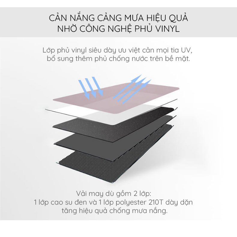 Mua tại TiktokKích thước gấp lại siêu gọn, gần như một chiếc smartphone và nặng chỉ khoảng 210gr. Phù hợp với các bạn nữ đi học đi làm. Chất liệu may cao cấp đặc biệt giúp giảm trọng lượng dù nhưng vẫn đảm bảo chất lượng. Có tới 7 màu sắc hiện đại cho bạn lựa chọn Lớp phủ vinyl công nghệ mới kết hợp với 1 lớp chống thấm nước và 2 lớp vải dù siêu dày mang lại hiệu ứng cản tia UV ưu việt, cắt 100% nắng. Vải may dù gồm 2 lớp: 1 lớp cao su đen và 1 lớp polyester 210T dày dặn tăng hiệu quả chống mưa nắng. 2 Lớp này được kết lại bằng loại keo đen siêu dính. Chất liệu: Vải Polyester 210T, Vải Cao Su Đen, Keo Siêu Dính, Lớp phủ Vinyl cản tia UV, Lớp phủ chống thấm nước Kích thước: mở ra rộng 94cm, phần cán 57cm, gấp vào thì dài 20cm.