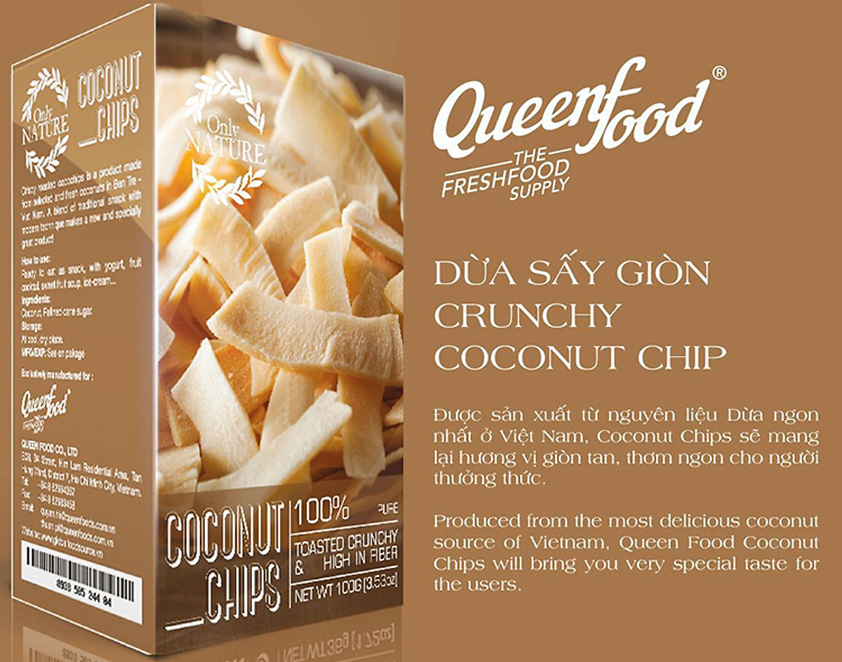 - Dừa Sấy Khô Queenfood Coconut Chips là sản phẩm sử dụng phương pháp sấy chân không hiện đại nên có vị giòn tan tự nhiên, thơm ngon, chất lượng vượt trội.