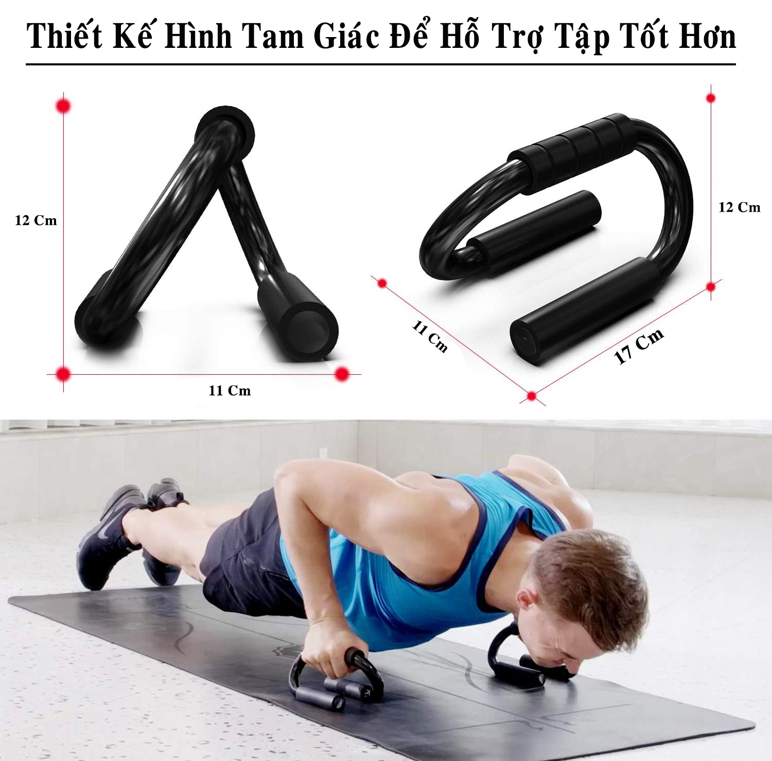 Chi Tiết Sản Phẩm: - Dụng cụ tập hít đất chuyên dụng cho bài tập chống đẩy (hít đất) luyện tập các cơ 1 cách hiệu quả và đúng cách. - Sản phẩm được các