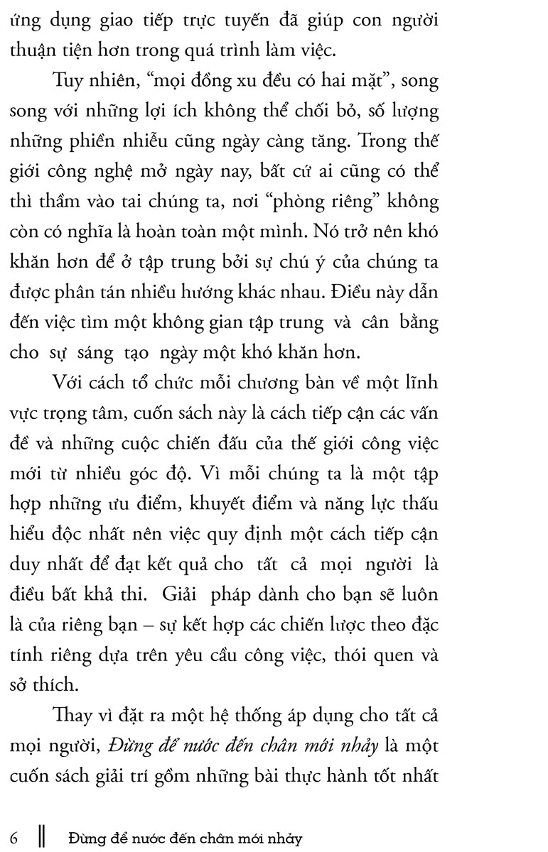 Với sự khôn ngoan có được từ 20 bộ óc sáng tạo hàng đầu, từ Dan Ariely đến Seth Godin, từ Mark McGuinness đến Tiffany Shlain, Đừng để nước đến chân mới nhảy mang đến cho bạn những kiến giải sâu sắc và giá trị của việc tối ưu hóa nhịp điệu hàng ngày.