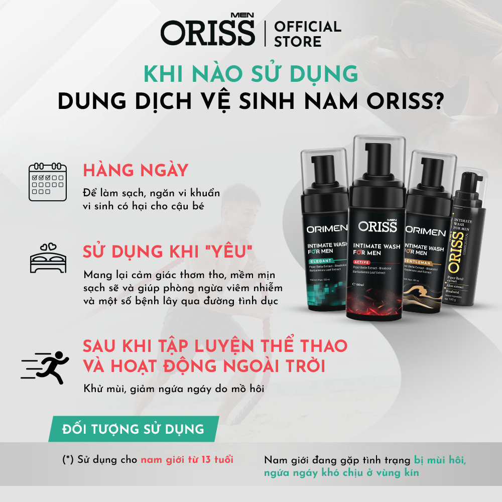 - Nam giới trên 12 tuổi cần vệ sinh. Có thể sử dụng Dung Dịch Vệ Sinh Nam Orimen để vệ sinh các vùng da khác.