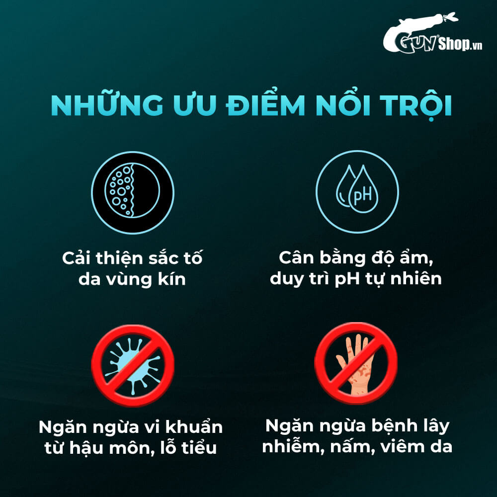✪ Đặc điểm: Dạng bọt, vệ sinh cơ quan sinh dục ngoài, ngăn mùi và khử mùi hiệu quả, mang lại cảm giác thoải mái, tự tin. Giúp kháng khuẩn và ngăn ngừa một số loại vi khuẩn, nấm gây bệnh. Cải thiện sắc tố da giúp da, giảm thâm và làm sáng da, giữ được độ đàn hồi và luôn luôn mịn màng. Tạo cảm giác mát lạnh, hương thơm bạc hà tự nhiên dễ chịu, thời gian lưu hương lâu. An toàn khi sử dụng lâu dài.